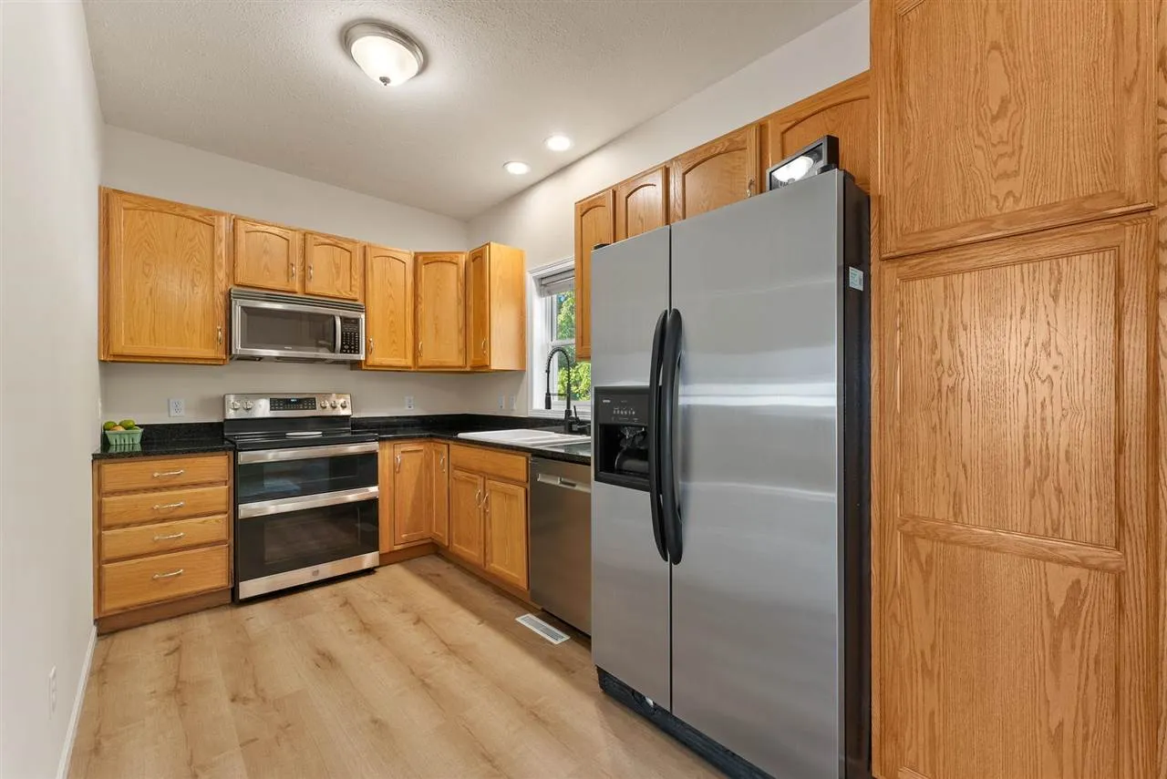 All the work has been done! Move right in to this stylishly refreshed home featuring fresh paint, updated appliances, and new flooring/trim. The main level boasts tall ceilings and plenty of natural light to create an airy and open feel. The kitchen shines with stainless steel appliances, soft-close doors, updated countertops, and spacious pantry. The open kitchen flows effortlessly into the dining and living areas to make the space feel bright and inviting. There are three spacious bedrooms on the main level including a large primary suite with dual sinks and walk-in closet. A full bath, laundry room with new washer and dryer, and linen closet are located next to two other large bedrooms. The finished walk-out lower level offers a fourth bedroom, full bath, and a generous family room with bar—ideal for entertaining, guests, or a home office setup. Step outside to a fully fenced, private backyard with a recently refinished deck, perfect for morning coffee or weekend get-togethers. Nestled in a quiet neighborhood close to shopping, schools, and parks, this home combines comfort, convenience, and modern style in one perfect package.