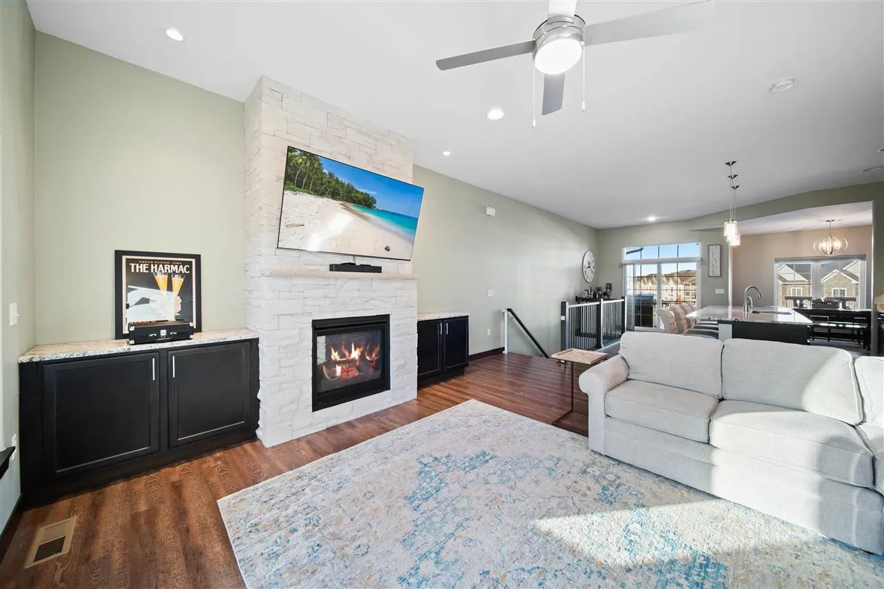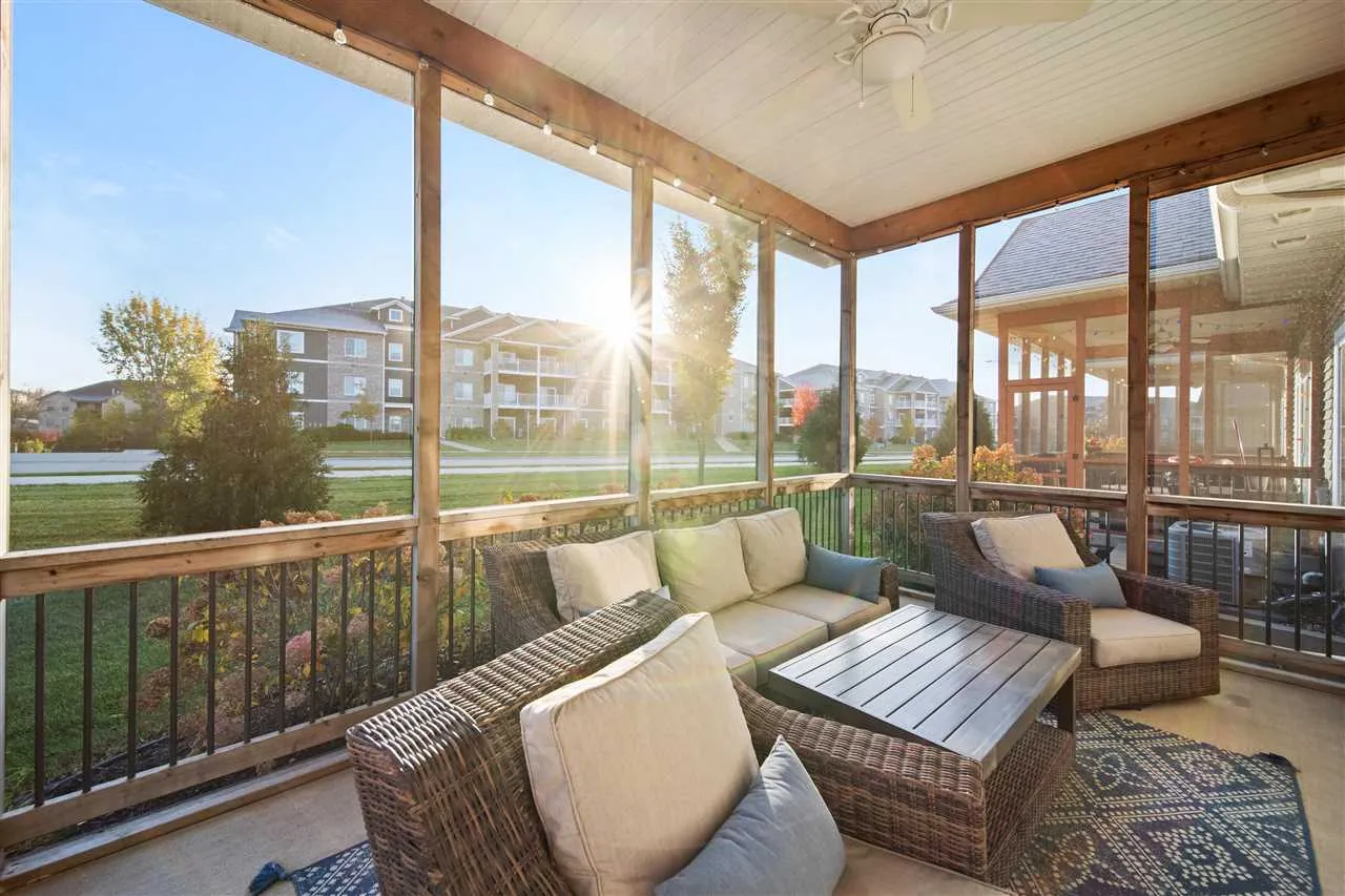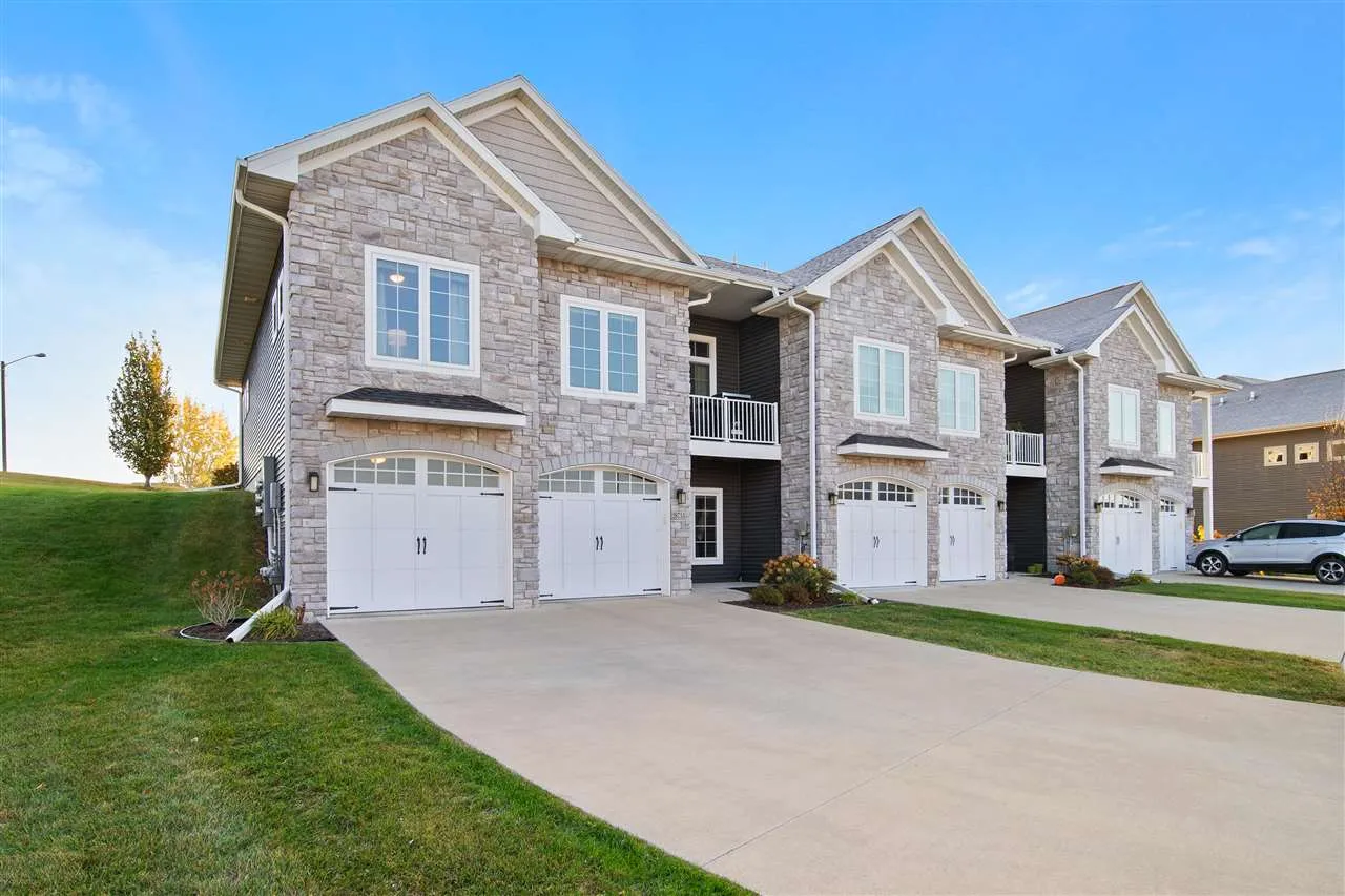 Stylish END UNIT adding “elbow room” from your neighbors and more windows for great natural light along with modern finishes and nestled in a prime Coralville location close to major roads, restaurants and shopping with some fantastic amenities! This engaging part stone 2 Story condo features soaring 9 ft. main level and 10 ft. upper level ceilings; white panel doors and brushed nickel hardware and fixtures; large family room; tremendous kitchen that boasts an expansive granite center island with breakfast bar and rich cabinetry along with premium slate GE appliances and pantry space; 9×11 dining room; tastefully decorated living room with a floor to ceiling stone fireplace and built-ins surround; cozy 10×16 screened porch with a concrete floor and dramatic 11 ft. ceilings; and 3 bedrooms including a luxurious primary suite accented with a designer ceiling and an all tile walk-in shower! Additional highlights include beautiful LVP flooring; a convenient balcony deck; built-in lockers and cubbies; laundry room with counter and cabinet space that comes with the raised front load LG washer/dryer; vinyl casement windows; and custom window treatments including blackout blinds on the upper level. Elegant, functional, and move-in ready—this home has it all!