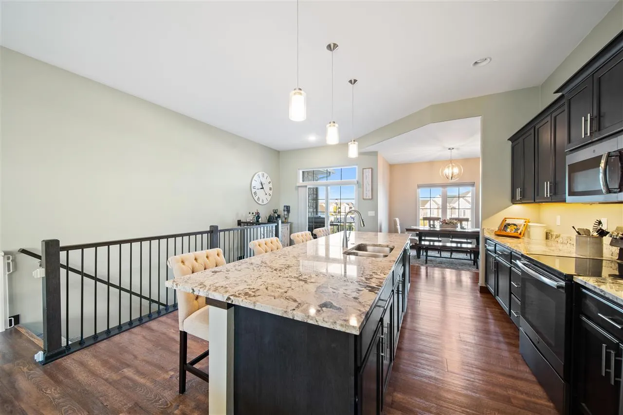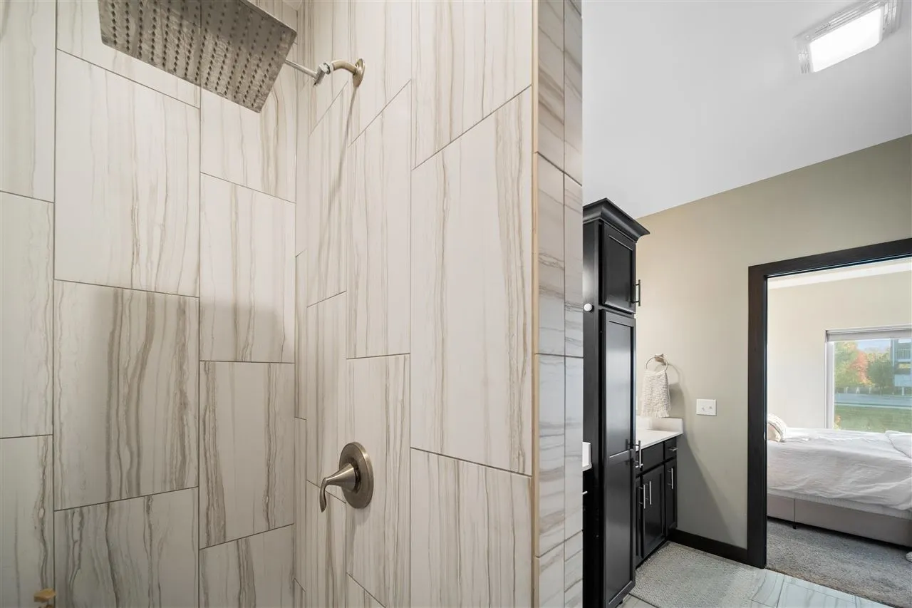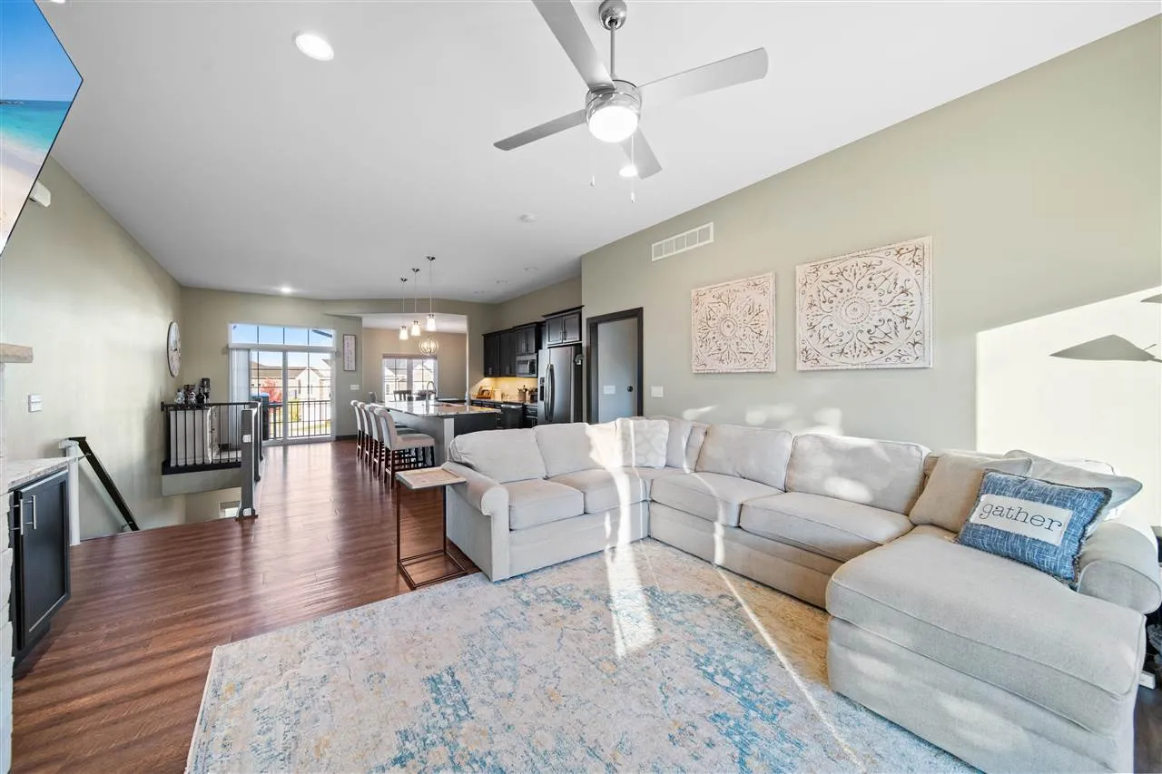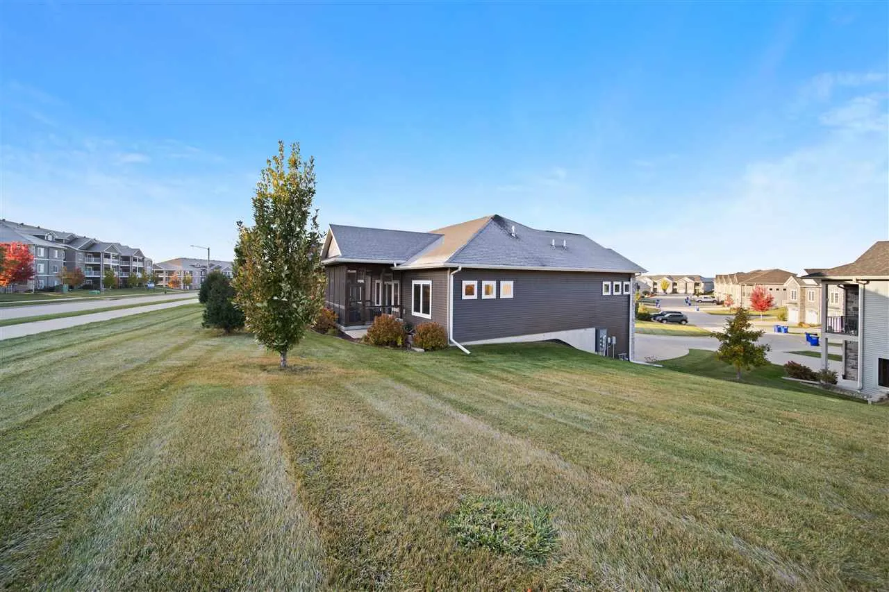 Stylish END UNIT adding “elbow room” from your neighbors and more windows for great natural light along with modern finishes and nestled in a prime Coralville location close to major roads, restaurants and shopping with some fantastic amenities! This engaging part stone 2 Story condo features soaring 9 ft. main level and 10 ft. upper level ceilings; white panel doors and brushed nickel hardware and fixtures; large family room; tremendous kitchen that boasts an expansive granite center island with breakfast bar and rich cabinetry along with premium slate GE appliances and pantry space; 9×11 dining room; tastefully decorated living room with a floor to ceiling stone fireplace and built-ins surround; cozy 10×16 screened porch with a concrete floor and dramatic 11 ft. ceilings; and 3 bedrooms including a luxurious primary suite accented with a designer ceiling and an all tile walk-in shower! Additional highlights include beautiful LVP flooring; a convenient balcony deck; built-in lockers and cubbies; laundry room with counter and cabinet space that comes with the raised front load LG washer/dryer; vinyl casement windows; and custom window treatments including blackout blinds on the upper level. Elegant, functional, and move-in ready—this home has it all!