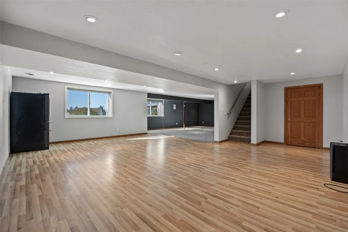 Are you longing for more space, a perfect blend of homey & room to grow? This drop dead gorgeous home sits on the 4th tee at Hunter’s Ridge Golf course, so no one behind you but expansive green & a pond that you do not have to maintain! This home has the perfect layout with the master on the main, a massive en suite w/ a spa like spa tub, glass enclosed shower & dual vanities w/ storage galore? Not to mention dual walk in closets! The living room is so large it dares you to try to fill it with friends enjoying the golf view out the entire wall of windows that looks like a Grant Wood painting this time of year! Think fall colors! Wow. The kitchen boasts new grey stainless appliances, a dual sided fireplace shared w/ the livingroom, eat in area & screened porch for that AM coffee, as well as a deck w/ hot tub. Upstairs are 3 more massive bedrooms & bath. LL is wide open for whatever you desire as well as another bed/bath!