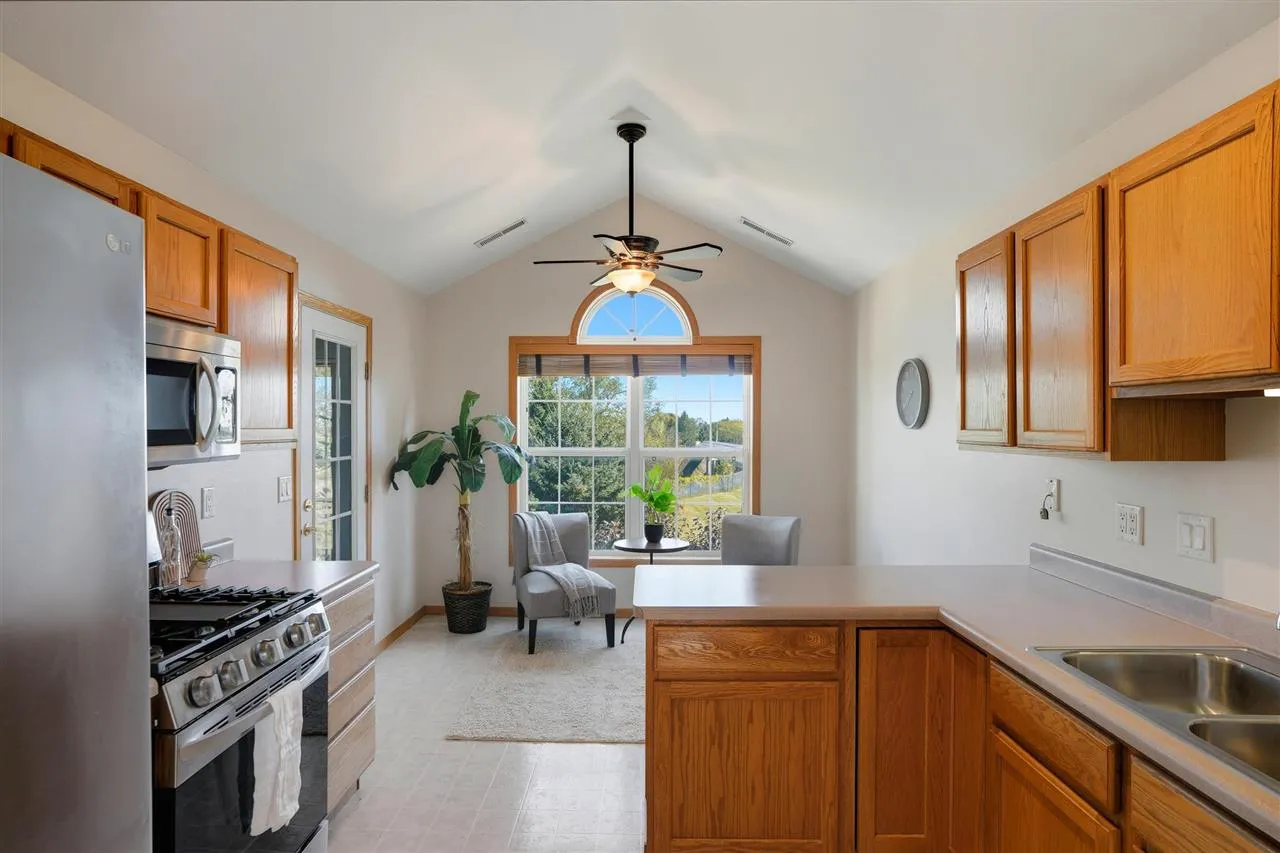 This impeccable top-floor condo offers an inviting open floor plan with soaring vaulted ceilings, a cozy living room featuring a gas fireplace with an elegant white mantle, and a formal dining or additional sitting area. The eat-in kitchen provides abundant cabinet storage and newer LG appliances, including a gas range. Two generous bedrooms include a primary suite with a large walk-in closet and a private bath with glass shower doors. Newer flooring and paint throughout. Conveniently located laundry with the washer and dryer included. Relax on the screened-in porch overlooking the peaceful surroundings. Additional updates include a newer A/C unit in 2022. A 1-car garage with an extra storage area completes this wonderful condo close to shopping, restaurants, parks, and the University of Iowa with easy access to I-380.