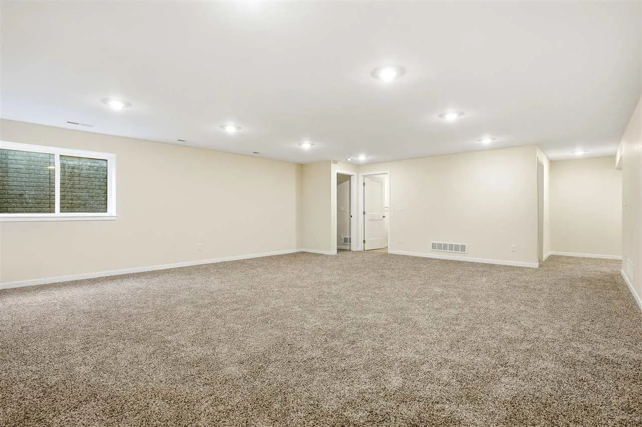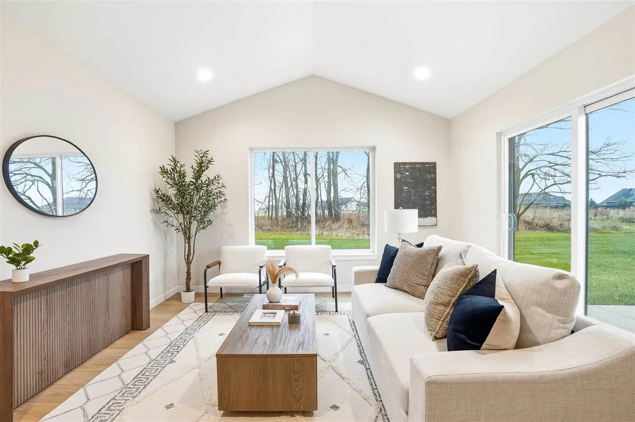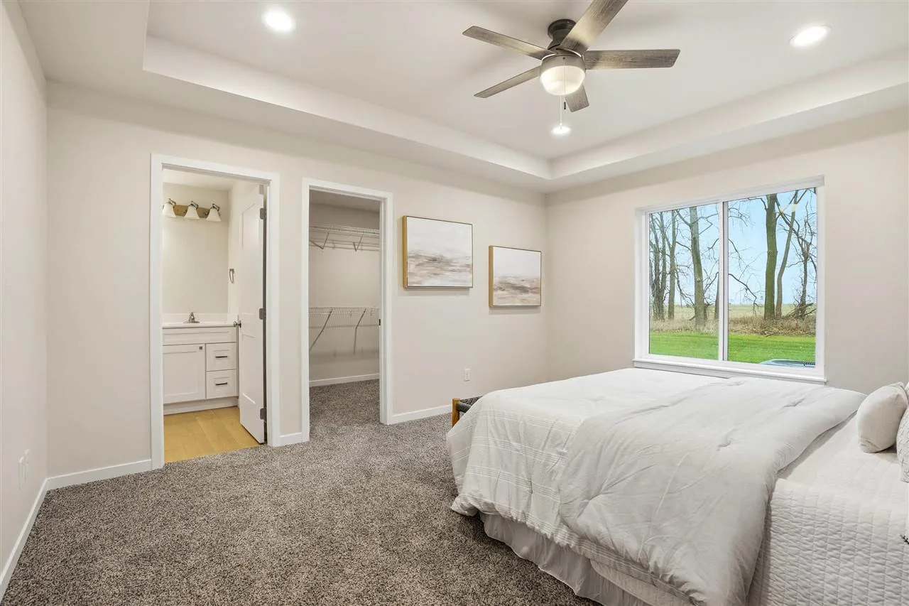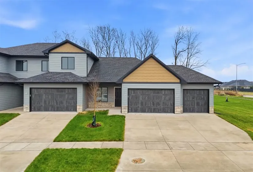 New construction end-unit ranch zero-lot home on a corner lot with a functional layout and modern finishes. This 3-bedroom, 2.5-bath home features an open main level with a U-shaped kitchen that includes stainless steel appliances, a pantry closet, and a breakfast bar flowing into the dining and living areas. A sliding door opens to the patio and spacious back and side yard, backing up to Veritas Church for added privacy with no rear neighbors. The main floor primary suite offers a walk-in closet, double vanity, and a tiled walk-in shower. Also on the main level are a second bedroom, a convenient powder room, and laundry room. The lower level adds a large rec room, third bedroom, full bath, and plenty of storage. With quick access to I-380, I-80, shopping, dining, and everyday conveniences, this home combines comfort and practicality for a variety of lifestyles. Construction is complete and property is available for a quick possession!