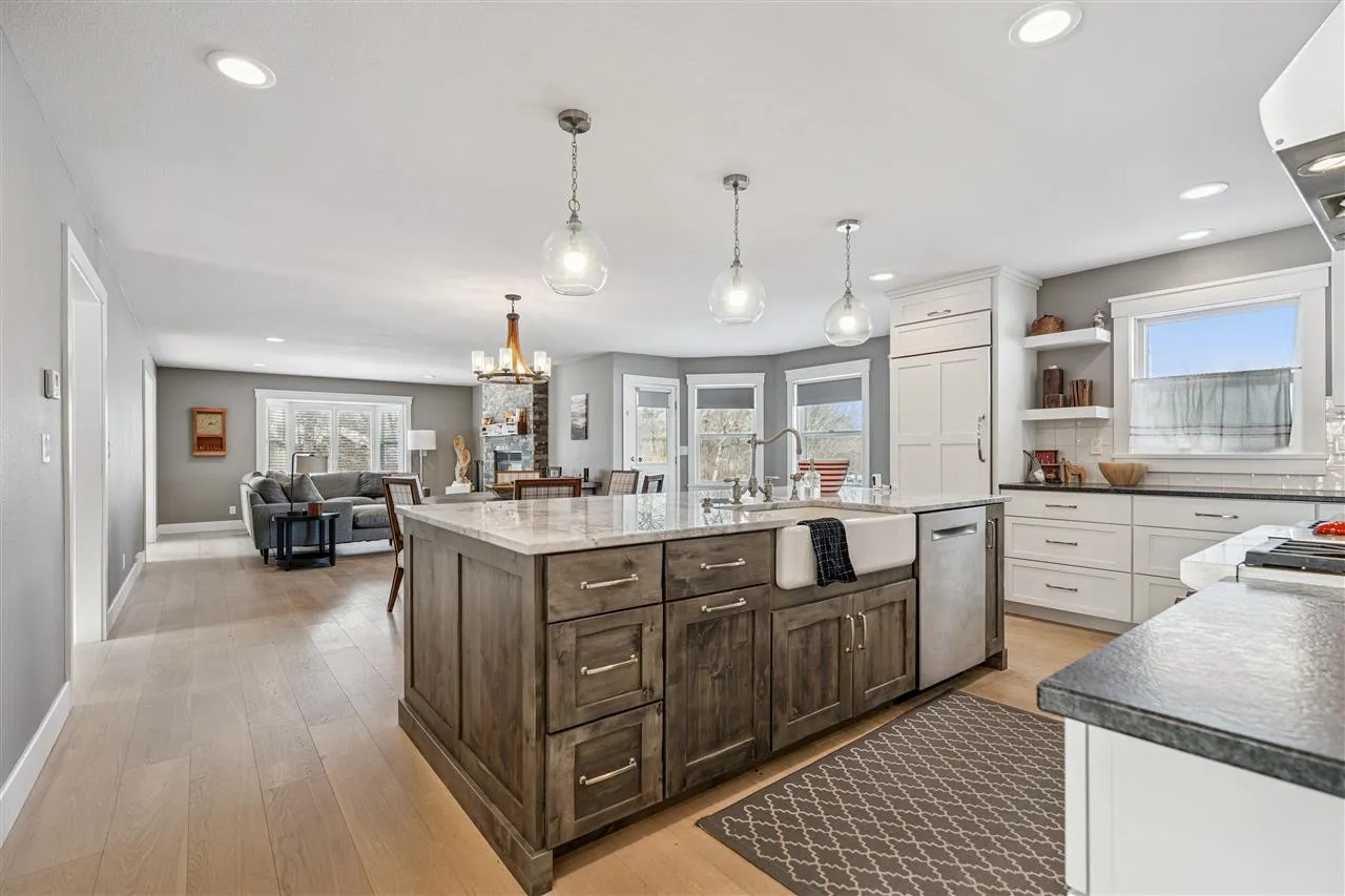 Surprise! This is the home you’ve been waiting for! Situated on a rare 1.02-acre in-town lot, this exceptional 5 Bedroom 2-story residence offers space, sophistication, and a beautifully executed Buresh remodel from the main level up—all within the desirable Viola, Harding, and Kennedy school districts. The heart of the home is the gourmet kitchen, thoughtfully designed for both everyday living and entertaining. It features white cabinetry taken to the ceiling, granite countertops, a Wolf gas range, integrated cabinet-front refrigerator, prep sink with Kohler fixtures, farmhouse sink at the island, and built-in storage beneath the breakfast bar. A large walk-in pantry provides excellent storage for small and large appliances. The open layout flows seamlessly into the dining area, comfortably seating six or more, and into the spacious family room filled with natural light, highlighted by a stacked-stone hearth with rustic mantel and custom shutters throughout. The main level is exceptionally functional, offering a large drop zone and laundry room located just off the oversized, heated 3-car garage, which includes two electric vehicle charging ports. A half bath near the kitchen and laundry area adds everyday convenience. Additional main-level spaces include a home office, an optional formal dining room.