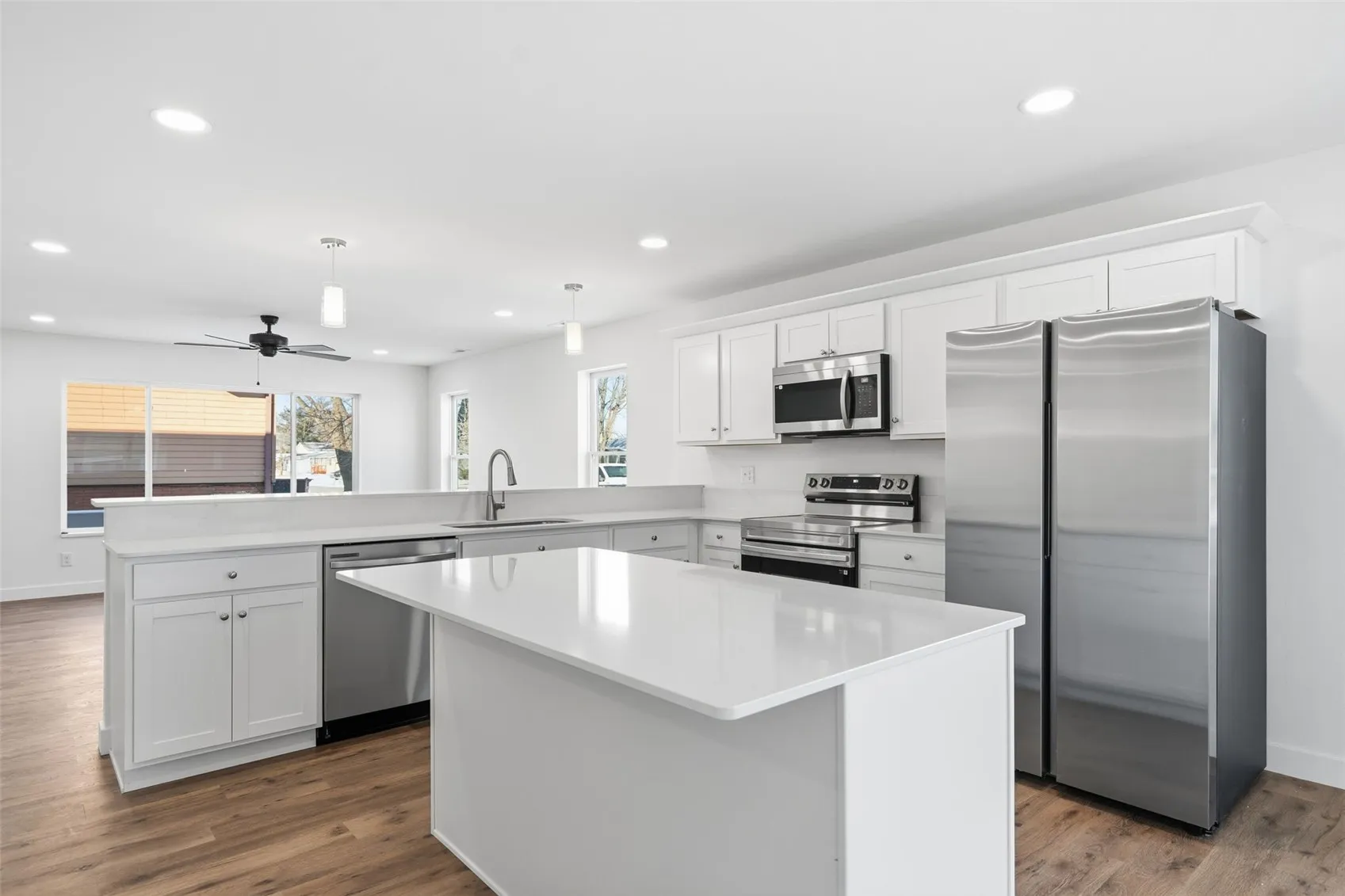 This newly built multifamily features three two-story units, each offering approximately 1,750 finished square feet with 3 bedrooms and 2.5 bathrooms. Every unit showcases an open-concept main level with a spacious living area, a modern kitchen, and a dining space, complemented by white cabinetry, quartz countertops, stainless steel appliances, durable LVP flooring, and a convenient half bath. Sliding patio doors lead to outdoor space, enhancing tenant appeal and livability.
