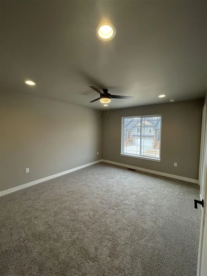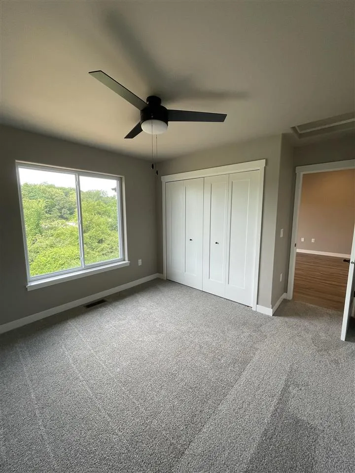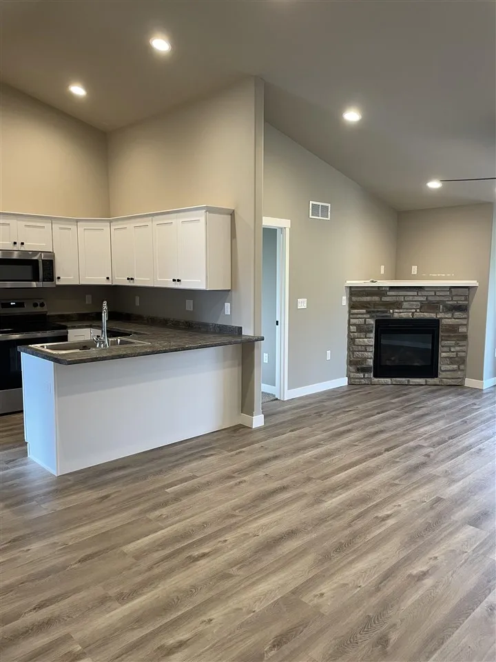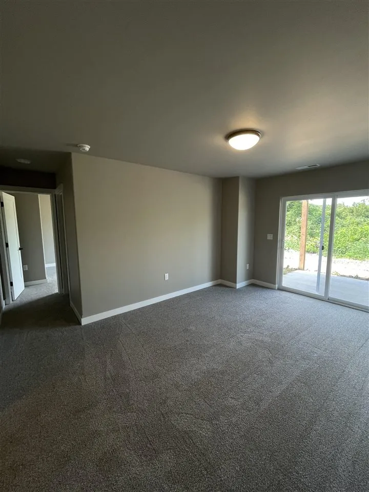 New Construction END UNIT Split-Level Townhome featuring 3 bedrooms and 3 full baths. Photos are of a similar property. Estimated Completion is May 2026. The main level offers an inviting open layout with a bright kitchen showcasing white cabinetry and light gray countertops, flowing seamlessly into the dining area and living room with direct access to a covered deck. The primary suite includes a private bathroom and walk-in closet, while a second bedroom and full bathroom complete the main level. The lower level provides a spacious recreation room with walk-out access to a patio, along with a third bedroom and an additional full bathroom