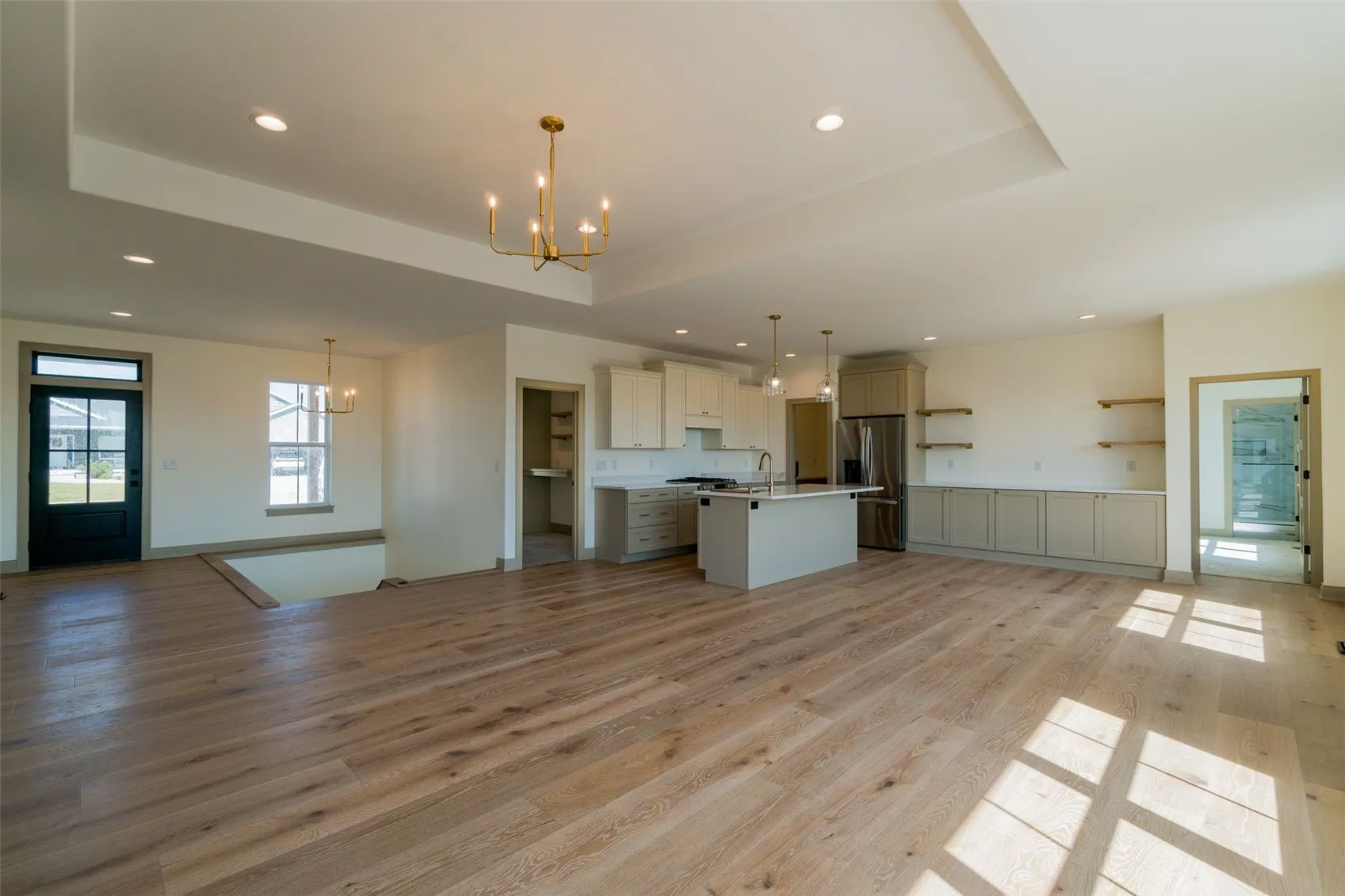 One of a kind new construction home just completed. Large main floor living area includes 10″ European White Oak floors, board and batten fireplace with built-in cabinet, and tray ceiling. Kitchen includes quartz countertops, gas range, large built-in sideboard with white oak shelves, and a large pantry with quartz countertops. Larger Primary suite with tray ceiling, large format tile shower, quartz countertops, and large master closet. Along with two additional bedrooms, the main floor has a laundry room equipped with custom lockers and a desk that can be used as a home office. Nine foot walkout basement includes a large living room, dry bar, two bedrooms, one bathroom. One bedroom is extra large measuring 15×22, which can serve as a home gym, play room, senior suite, or converted into two bedrooms for an additional cost. Other highlights: central vac roughed in, tankless water heater, extra deep 3 stall garage.