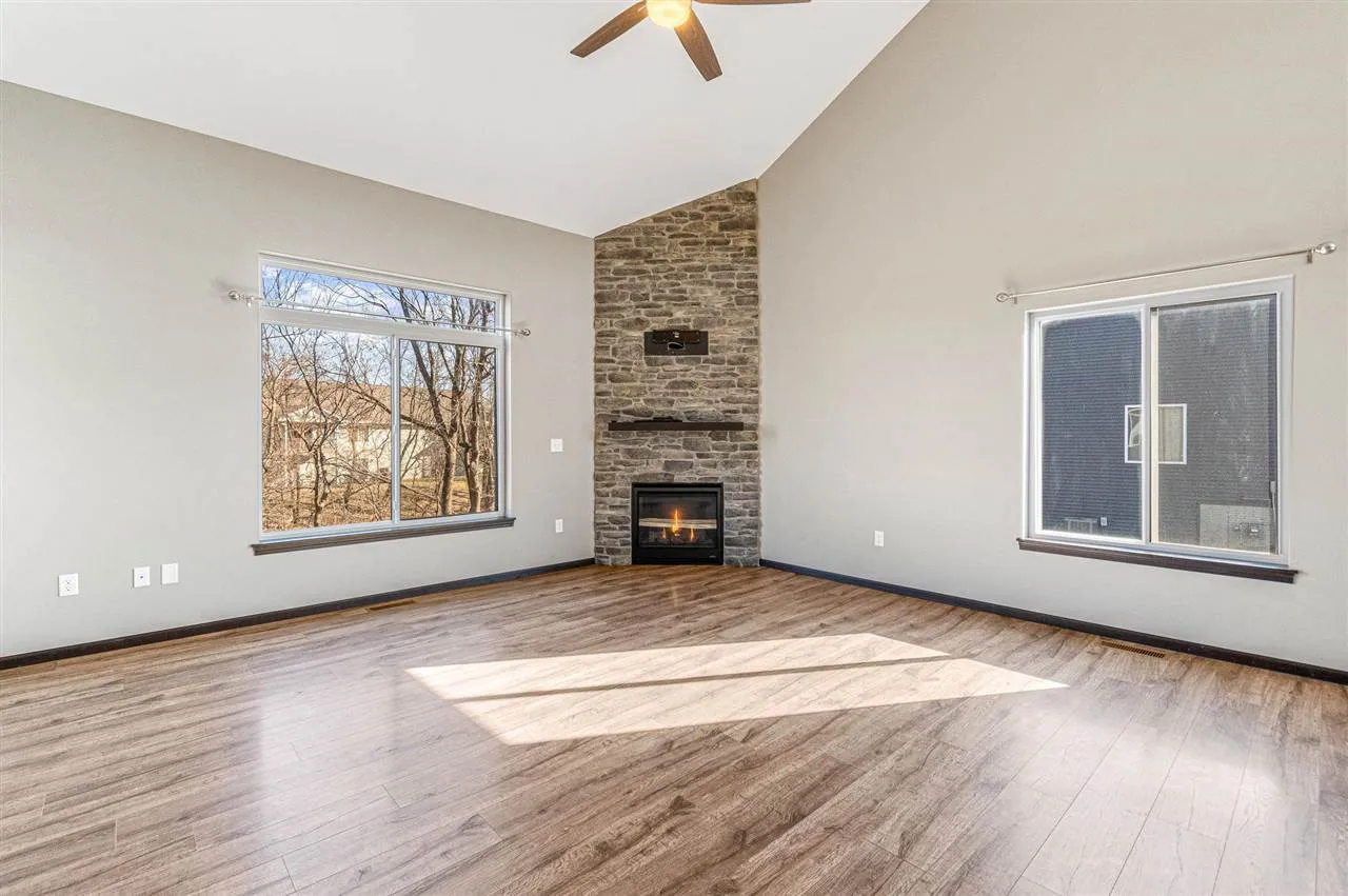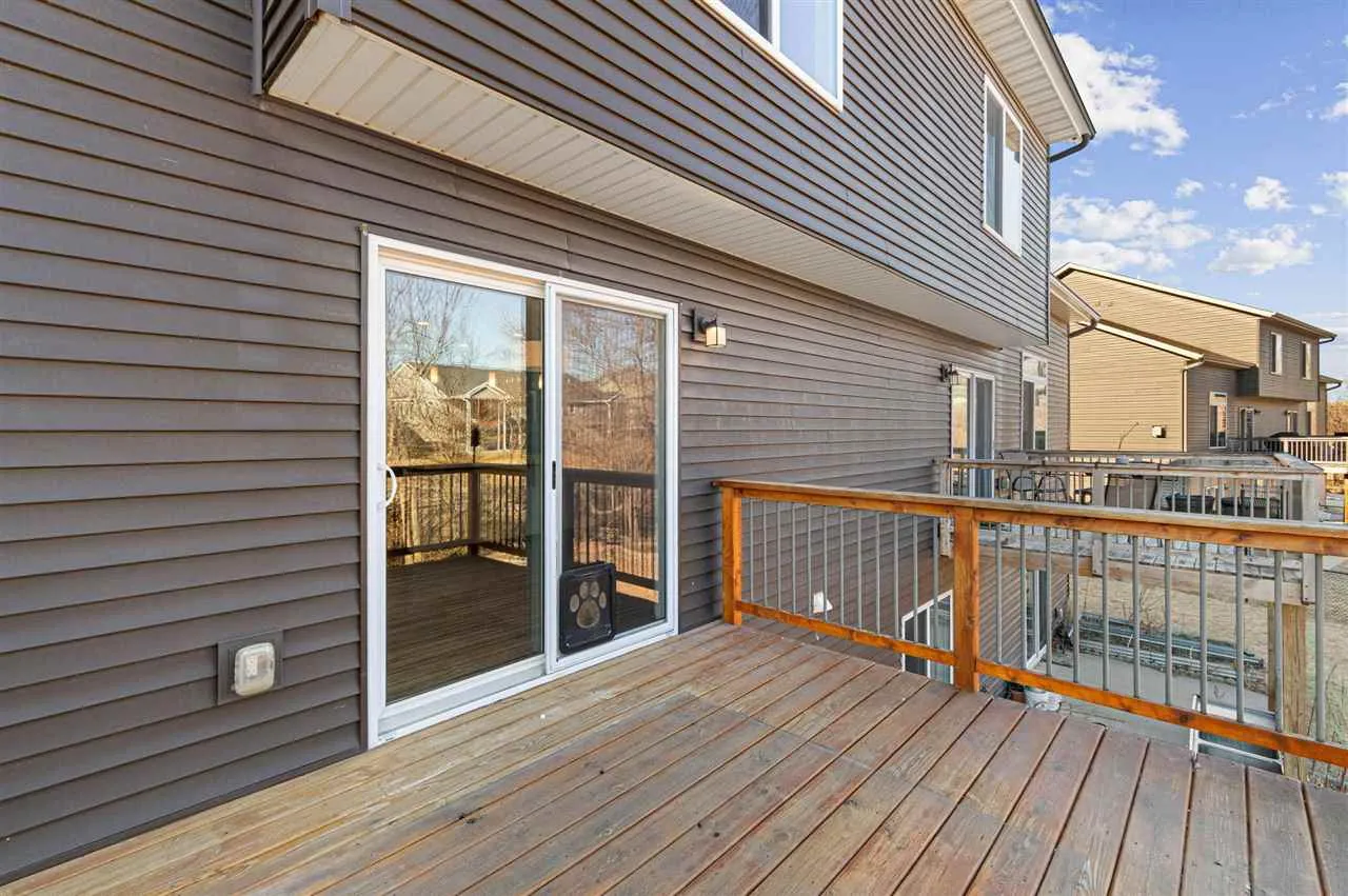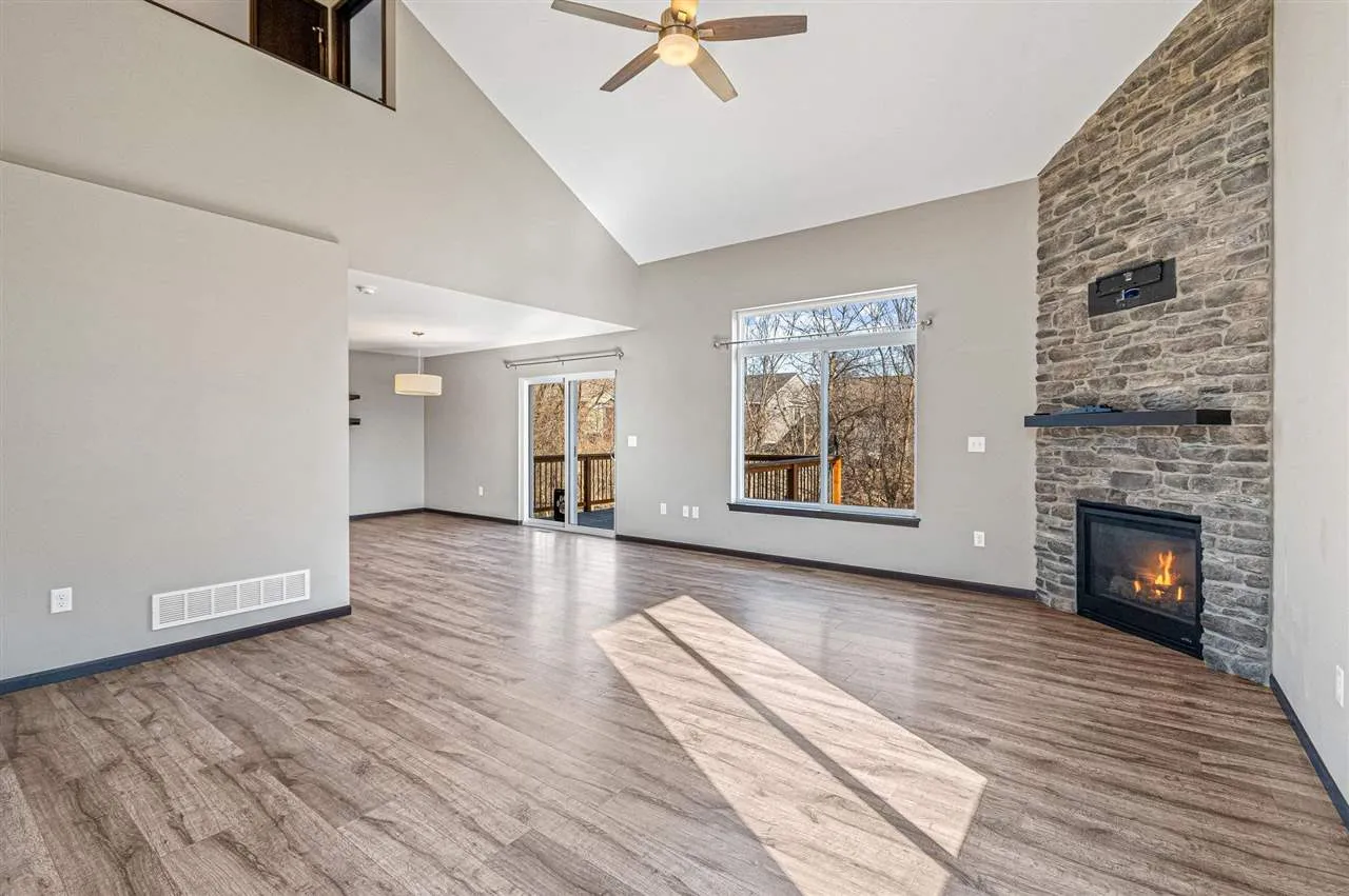 Step into a stylish two-story zero-lot home in Tiffin’s Rolling Hills neighborhood. Built in 2019, this 2,222-sq-ft home welcomes you with soaring ceilings in the great room, a floor-to-ceiling stone fireplace and luxury vinyl plank flooring. The open kitchen features high-definition laminate counters, a flush breakfast bar, desk area and updated stainless-steel appliances. The dining area opens to a deck overlooking a large and fenced in yard. Upstairs you’ll find three generous bedrooms, including the primary suite, plus a convenient laundry. Two full baths feature ceramic tile and quality fixtures and there’s a main-level powder room. The walkout lower level is professionally finished with extra living space, a fourth bedroom and additional full bath. An attached two-car garage, central air and natural-gas forced air with fireplace insert ensure comfort year-round. Set on a deep lot with mature trees as the back drop, this home offers low-maintenance living near parks, schools and trails. Tiffin is Iowa’s fastest-growing city, strategically located at the I-80/I-380 interchange with quick access to the University of Iowa and Eastern Iowa Airport