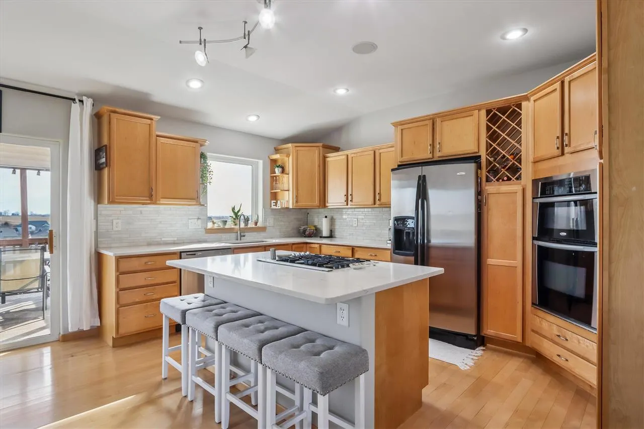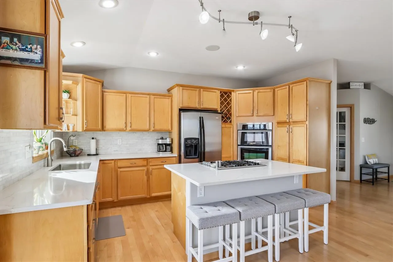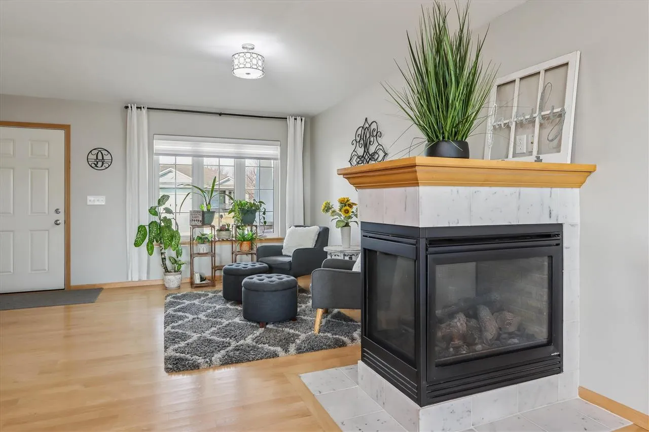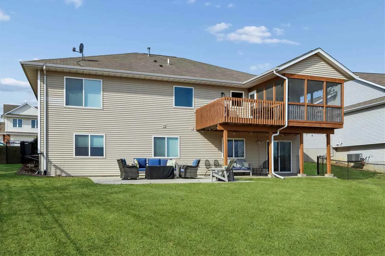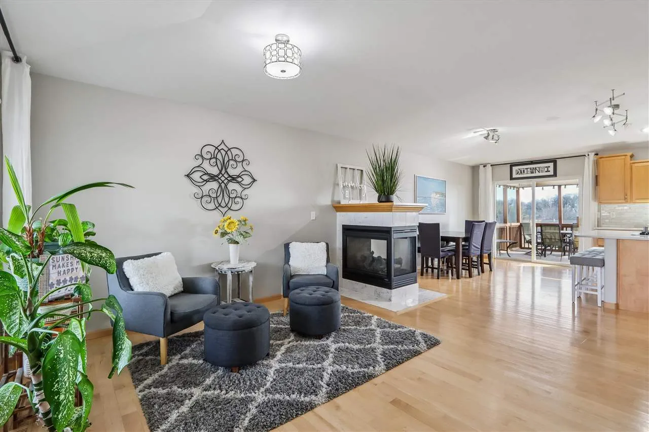 Bright, beautifully updated home featuring maple floors and a striking 3-sided gas fireplace. The 2025 kitchen renovation offers quartz countertops, marble backsplash, stainless steel appliances, and gas cooktop, with slider to a screened porch and grilling deck. Main-level office/flex room with French doors. Primary suite includes walk-in closet and spa-like bath with steam shower and soaking tub. Walkout lower level offers 2 additional bedrooms, spacious family room, and wet bar. Extended patio and fenced yard ideal for entertaining. 3-car garage, mudroom, and main-floor laundry. New furnace & AC installed February 2026.