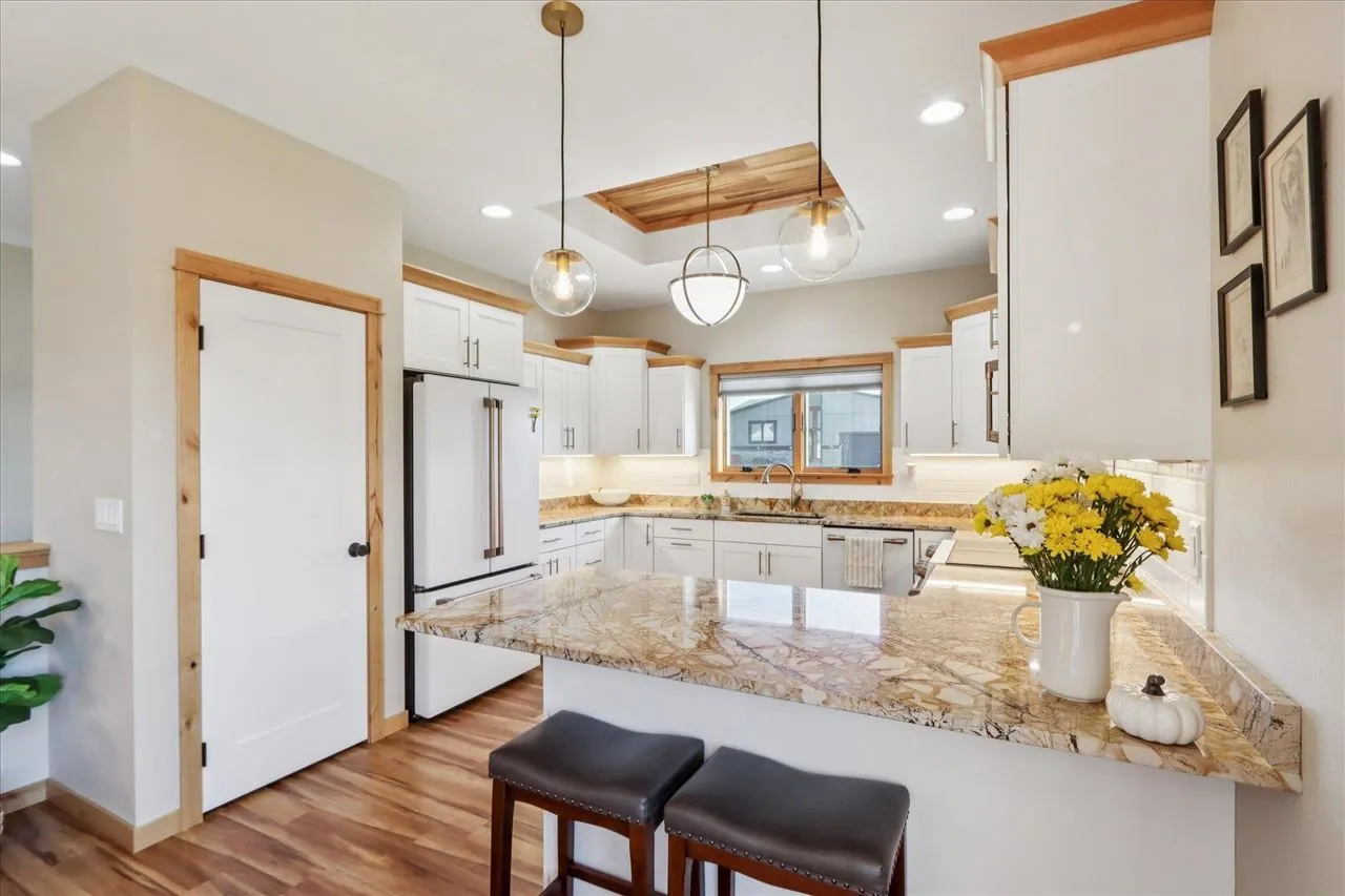 Eastside quality-built home situated on a private corner walk-out lot in Churchill Meadows. The open-concept main level offers seamless flow and abundant natural light, with a covered deck just off the living room—ideal for everyday living and entertaining. The kitchen features copper-infused granite countertops, custom soft-close white cabinetry, white GE Café appliances, a pantry, and a spacious breakfast bar. This home offers 4 bedrooms and 3 bathrooms, including a spacious primary suite with a tiled walk-in shower and generous walk-in closet. Flat panel doors with knotty alder trim add warmth and character throughout. The finished walk-out lower level includes a large family room, game area, and a granite wet bar—well suited for gatherings. An oversized 2-car garage connects to a functional mudroom with lockers and laundry. A 255 sq ft garden room off the back of the home provides excellent additional storage space.