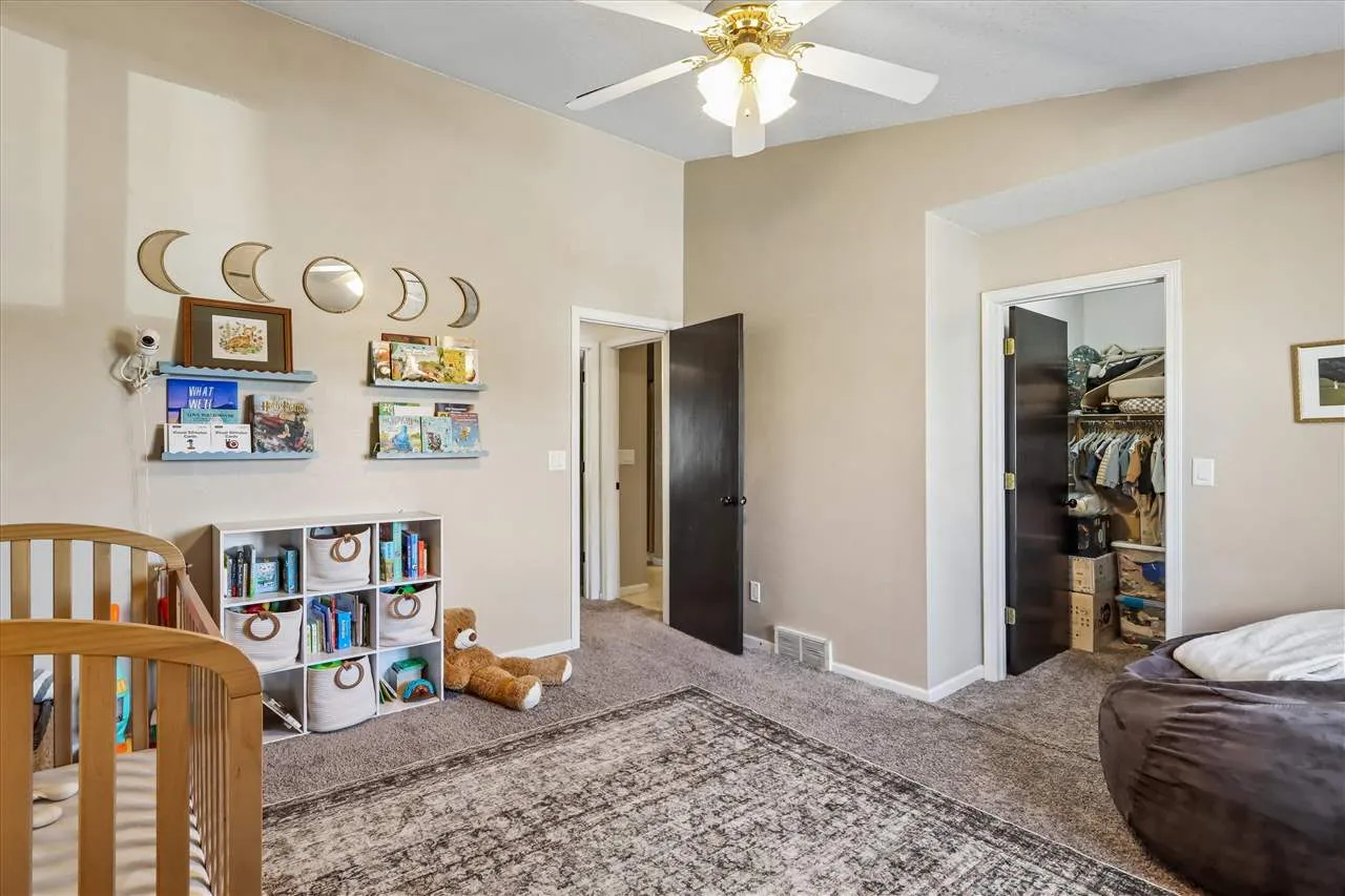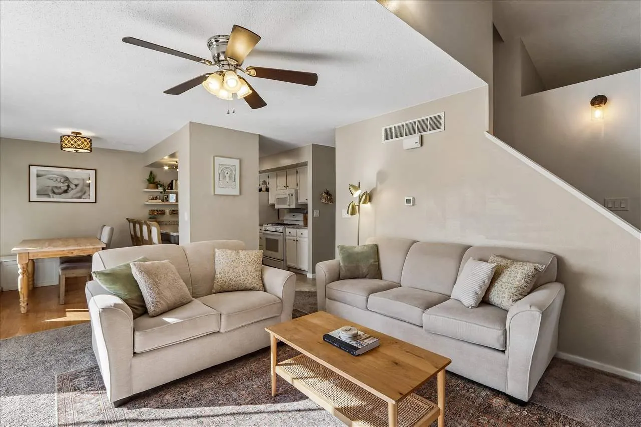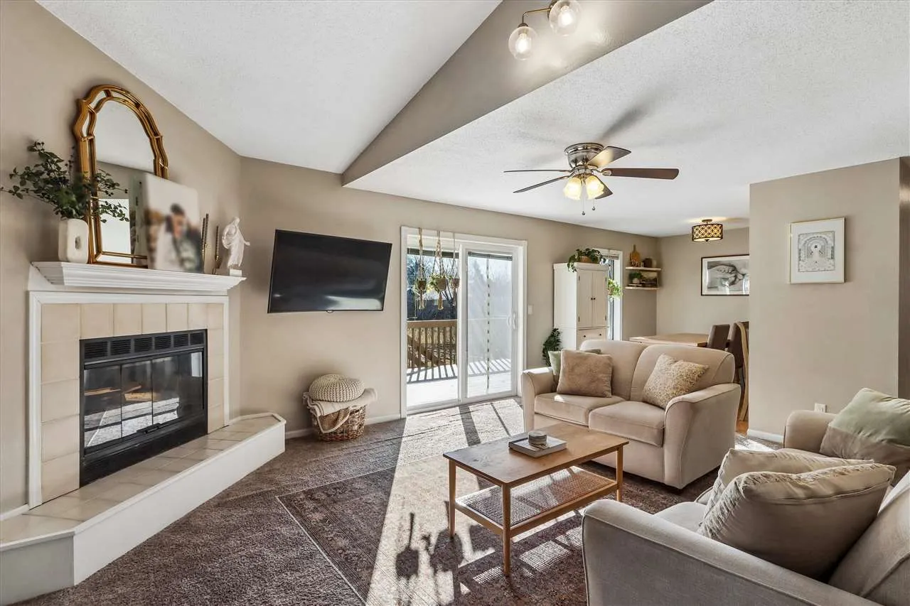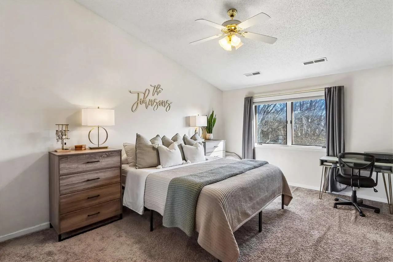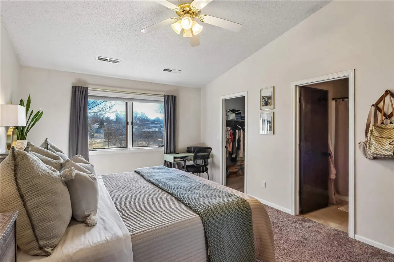 Beautifully maintained 2-story home with an inviting feel throughout! The bright and airy great room is filled with natural light and features a cozy wood-burning fireplace. The kitchen offers updated countertops, white painted cabinets, a breakfast bar, plus a built-in pantry cabinet and charming bench seating in the dining area. Step outside to enjoy the extra-large deck, recently stained, overlooking a spacious green space — perfect for relaxing or entertaining. Upstairs, you’ll find 2 generously sized bedrooms with vaulted ceilings and walk-in closets. The primary bedroom has direct access to the large bath, complete with convenient second-floor laundry. The lower level family room provides wonderful flexibility and could also serve as a 3rd bedroom, guest space, home office, or movie room, with its own private bath and large closet. You’ll also appreciate the abundant storage in the lower level, along with a newer water softener and water filtration system. Major updates include a new A/C in 2019 and a new roof in 2023. Handy 2 car garage. Conveniently located just one block from the bus stop for easy commuting to the UofI, with quick access to shopping plus a 10 minute walk to North Ridge Park! Washer/dryer and all shelving negotiable. TVs & mounts are reserved