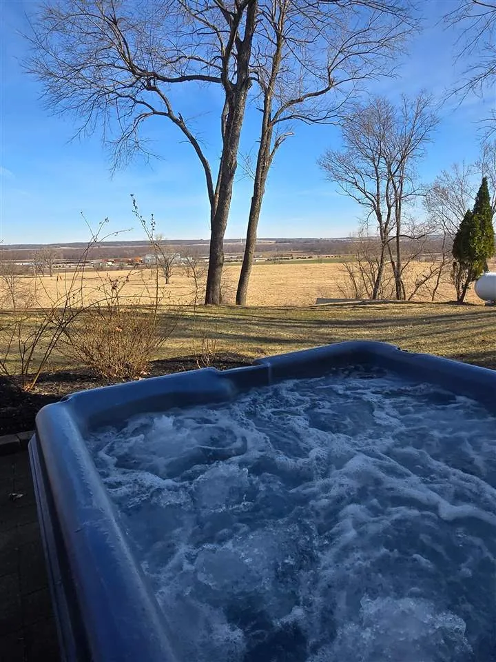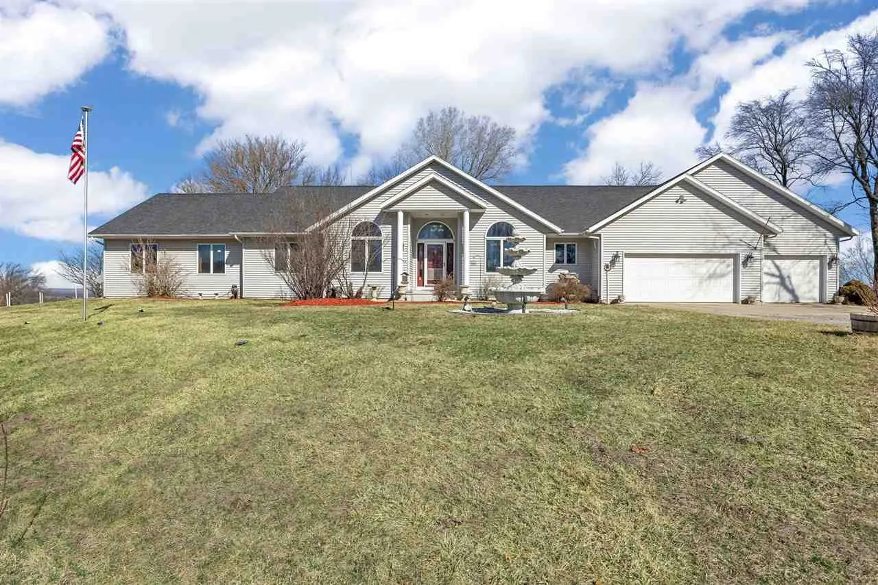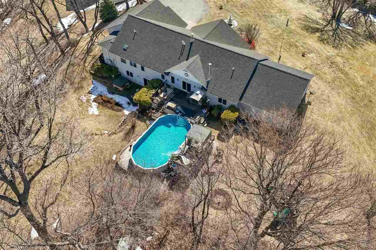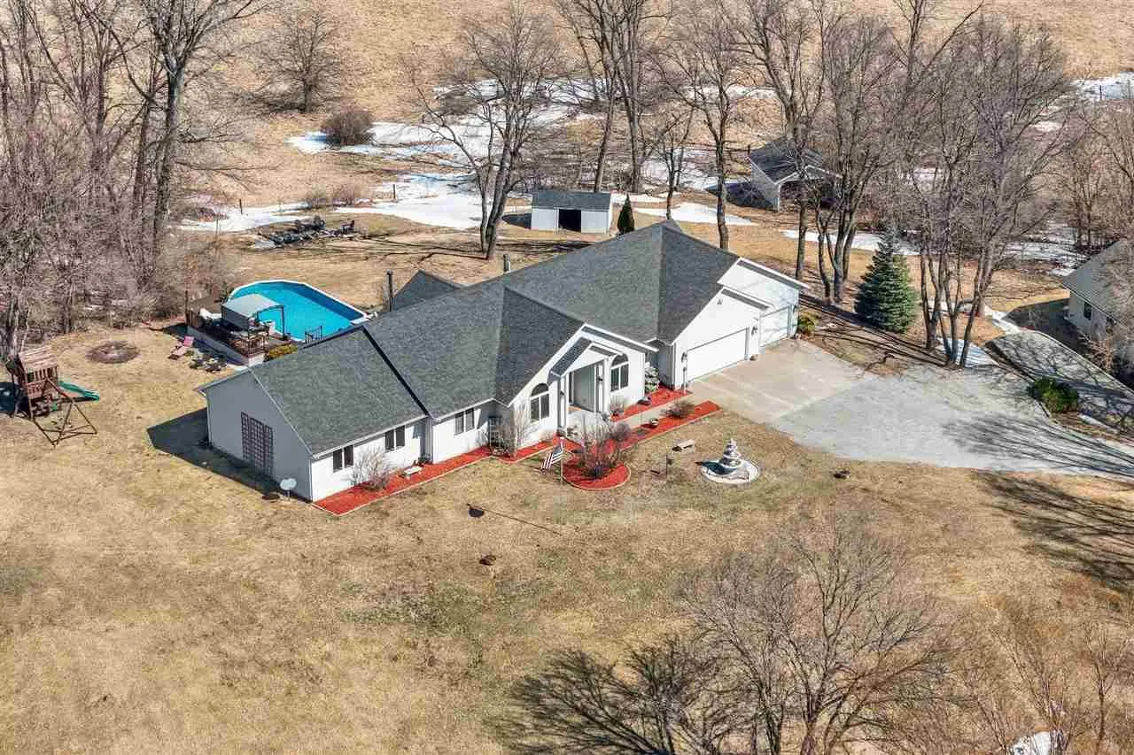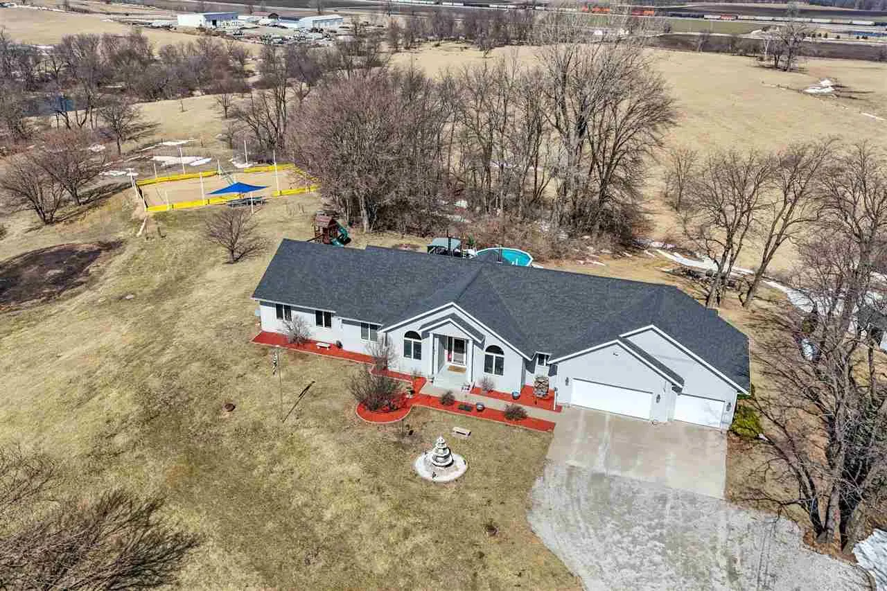 Welcome to your scenic retreat on nearly 6 acres, where comfort and natural beauty come together. With over 5000 sq ft of living space, this exceptional ranch showcases refined finishes, expansive views, and resort-style amenities. Vaulted ceilings and beautifully integrated open concept design connect the kitchen, dining, and living areas, ideal for entertaining. A wood burning fireplace anchors the living room, while tile and wood flooring add warmth and character throughout. The main level offers four spacious bedrooms and two full baths, including a primary suite with tray ceiling, private en-suite bath with heated floors, and an oversized, custom walk-in closet. The lower level features a stylish gathering space with an Irish pub-style bar, game room, exercise space, fifth bedroom, full bath, and indoor basketball shooting court with 30 ft. ceiling for year-round recreation. A walkout leads to the hot tub, extending the entertaining space outdoors. Outdoor amenities include sweeping views, wildflower landscaping, heated above ground pool with deck, fire pit, and lighted AVP caliber sand volleyball court. RV pad and hookup and detached 1200 sq ft heated garage with car wash bay and bar/media area complete the property. Offering something for everyone, this exceptional ranch blends neighborhood living with a country feel.