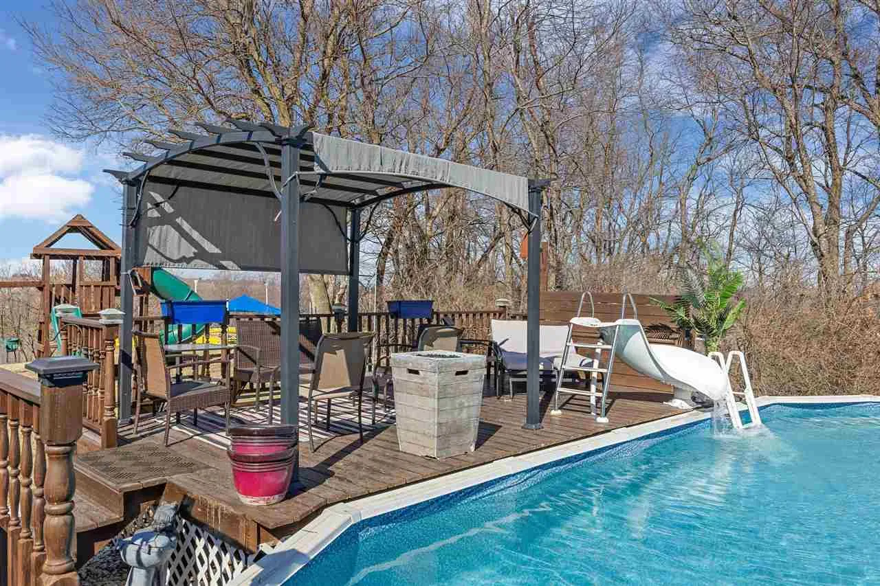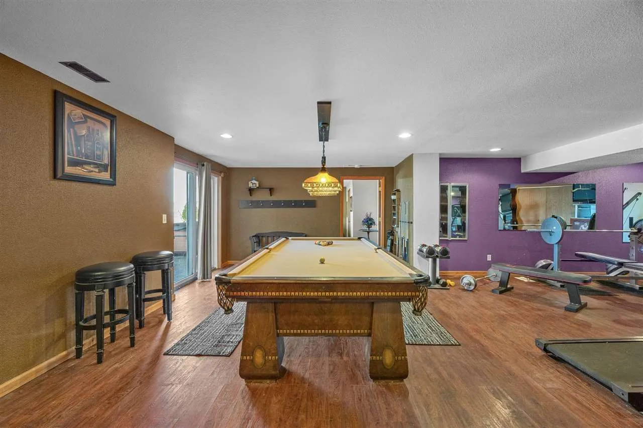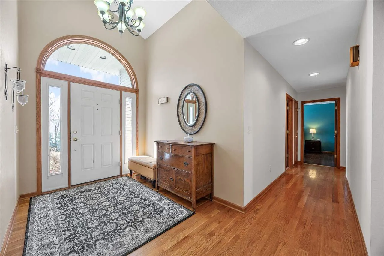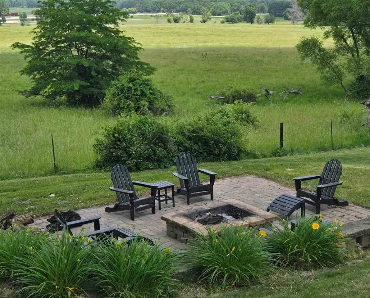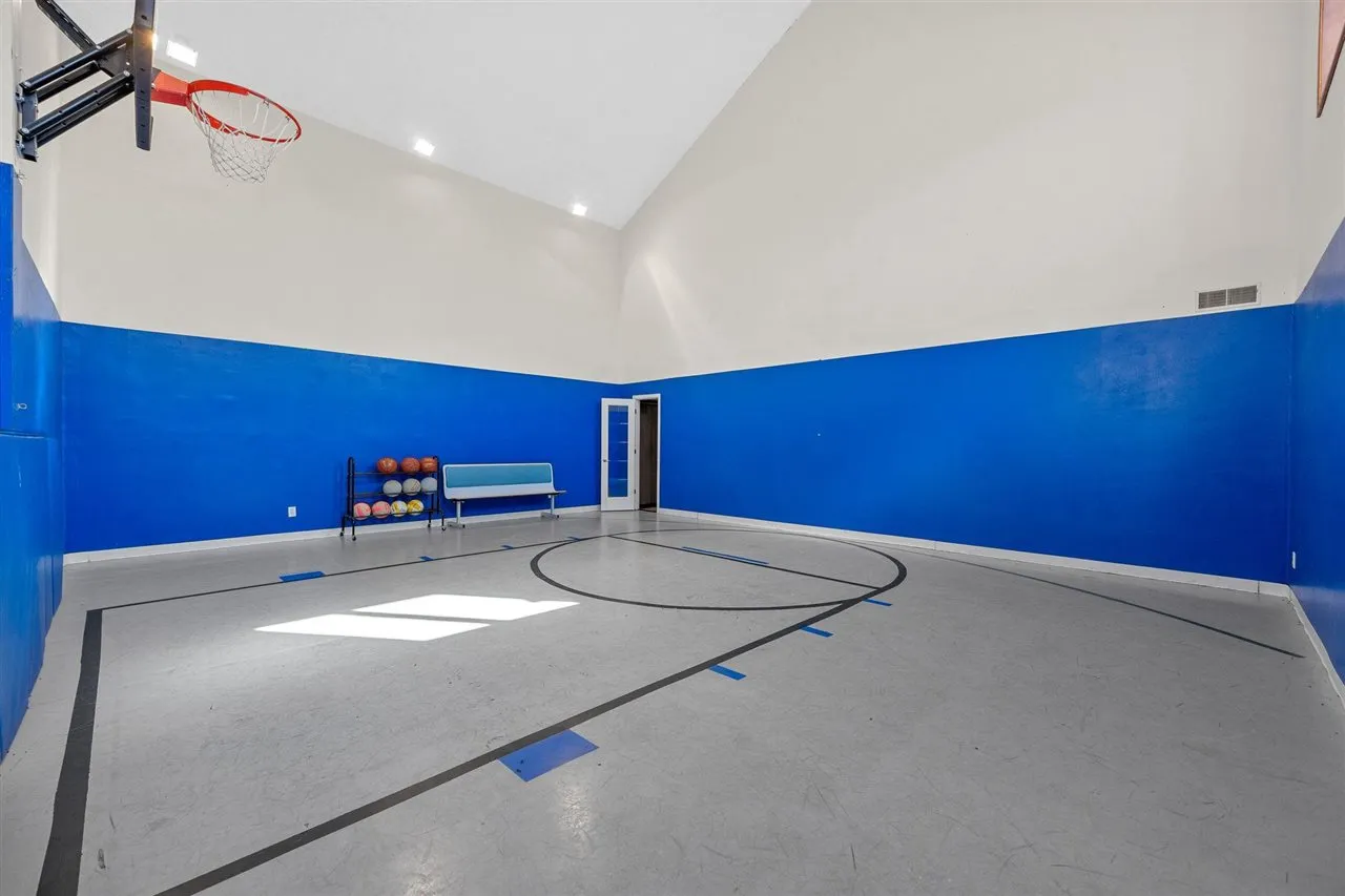 Welcome to your scenic retreat on nearly 6 acres, where comfort and natural beauty come together. With over 5000 sq ft of living space, this exceptional ranch showcases refined finishes, expansive views, and resort-style amenities. Vaulted ceilings and beautifully integrated open concept design connect the kitchen, dining, and living areas, ideal for entertaining. A wood burning fireplace anchors the living room, while tile and wood flooring add warmth and character throughout. The main level offers four spacious bedrooms and two full baths, including a primary suite with tray ceiling, private en-suite bath with heated floors, and an oversized, custom walk-in closet. The lower level features a stylish gathering space with an Irish pub-style bar, game room, exercise space, fifth bedroom, full bath, and indoor basketball shooting court with 30 ft. ceiling for year-round recreation. A walkout leads to the hot tub, extending the entertaining space outdoors. Outdoor amenities include sweeping views, wildflower landscaping, heated above ground pool with deck, fire pit, and lighted AVP caliber sand volleyball court. RV pad and hookup and detached 1200 sq ft heated garage with car wash bay and bar/media area complete the property. Offering something for everyone, this exceptional ranch blends neighborhood living with a country feel.