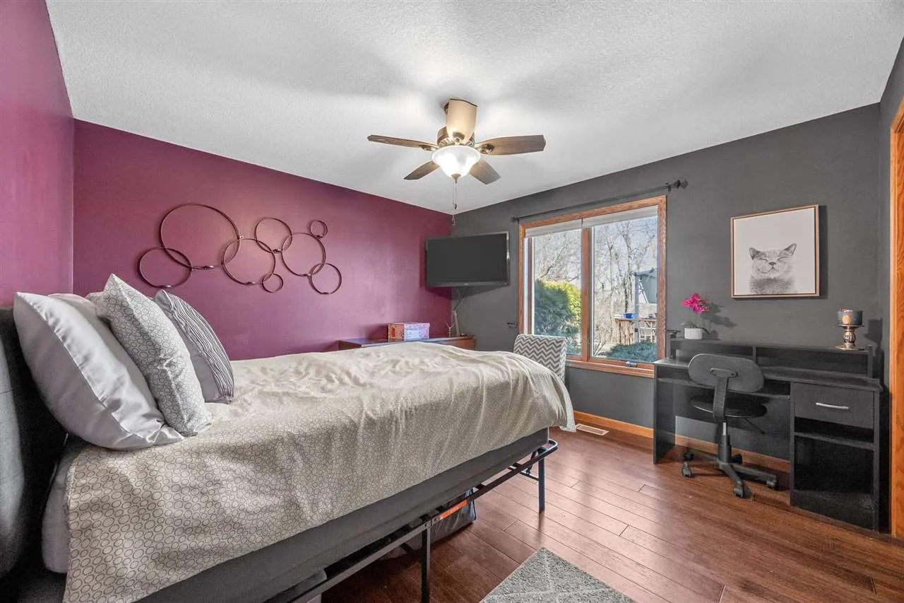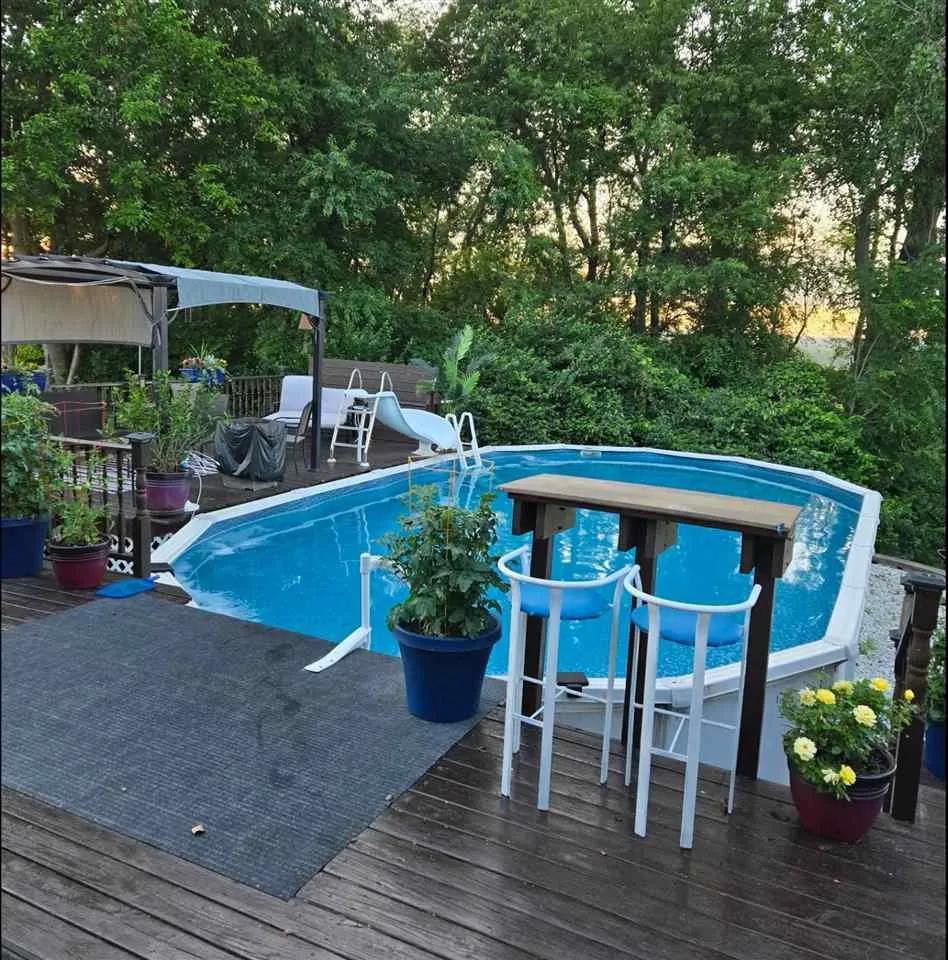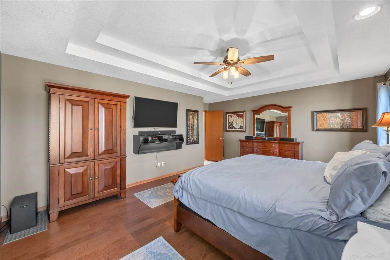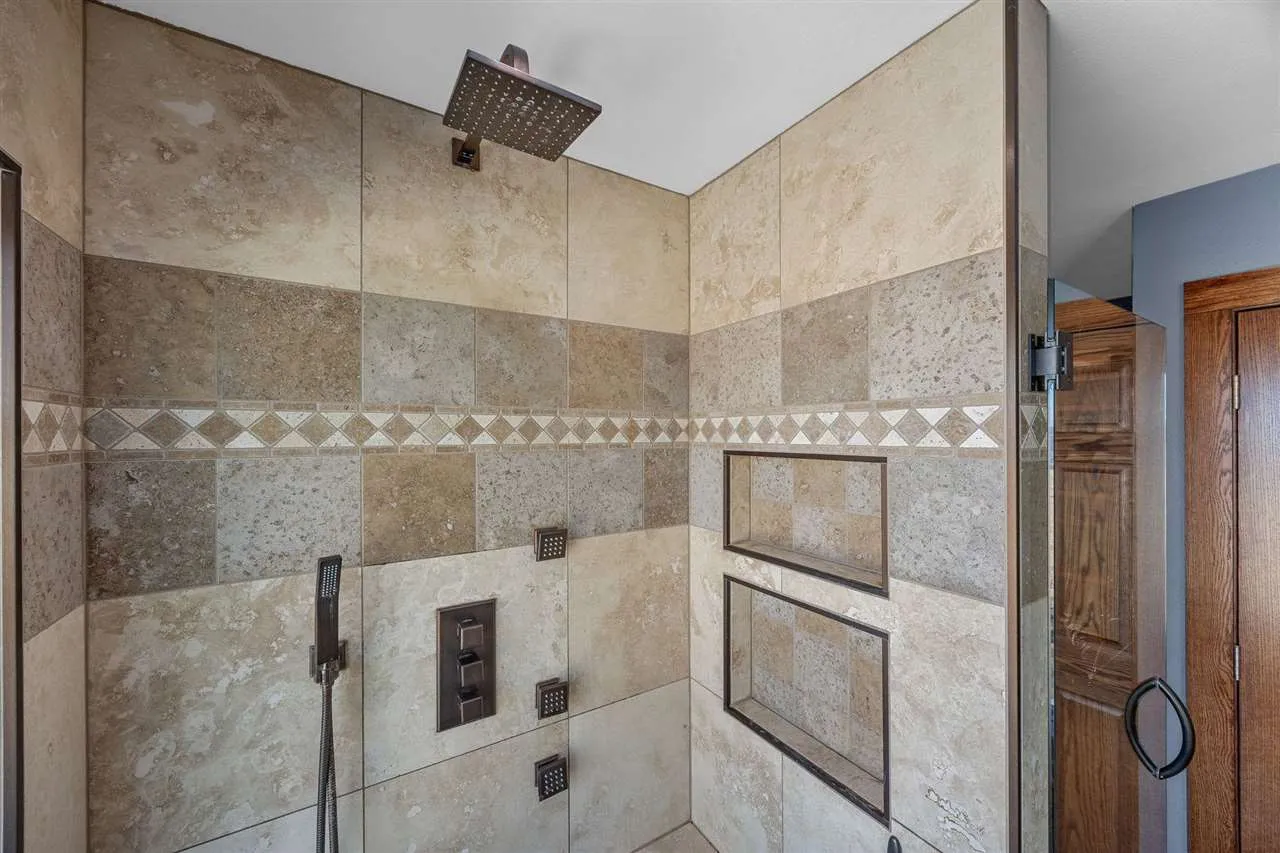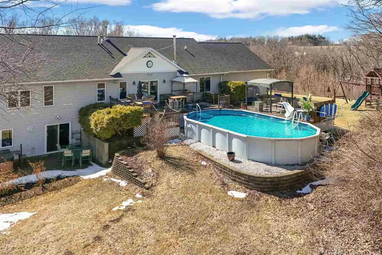 Welcome to your scenic retreat on nearly 6 acres, where comfort and natural beauty come together. With over 5000 sq ft of living space, this exceptional ranch showcases refined finishes, expansive views, and resort-style amenities. Vaulted ceilings and beautifully integrated open concept design connect the kitchen, dining, and living areas, ideal for entertaining. A wood burning fireplace anchors the living room, while tile and wood flooring add warmth and character throughout. The main level offers four spacious bedrooms and two full baths, including a primary suite with tray ceiling, private en-suite bath with heated floors, and an oversized, custom walk-in closet. The lower level features a stylish gathering space with an Irish pub-style bar, game room, exercise space, fifth bedroom, full bath, and indoor basketball shooting court with 30 ft. ceiling for year-round recreation. A walkout leads to the hot tub, extending the entertaining space outdoors. Outdoor amenities include sweeping views, wildflower landscaping, heated above ground pool with deck, fire pit, and lighted AVP caliber sand volleyball court. RV pad and hookup and detached 1200 sq ft heated garage with car wash bay and bar/media area complete the property. Offering something for everyone, this exceptional ranch blends neighborhood living with a country feel.
