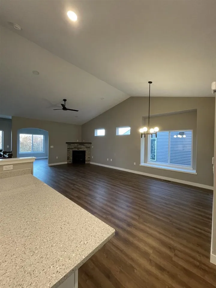 This new construction 4-bedroom, 3-bath ranch blends timeless finishes with a thoughtfully designed, functional layout. Photos are of a similar property. Estimated completion is July 2026. The home’s standout feature is a bright sunroom that opens to a covered deck—perfect for relaxing or entertaining. The kitchen showcases white cabinetry and quartz countertops, flowing seamlessly into the main living area, where vaulted ceilings and a stunning stone fireplace create a warm, inviting space. The walkout lower level expands your living area with two additional bedrooms, a full bath, and direct access to the backyard. Enjoy outdoor living on the large covered patio overlooking a beautiful pond view.