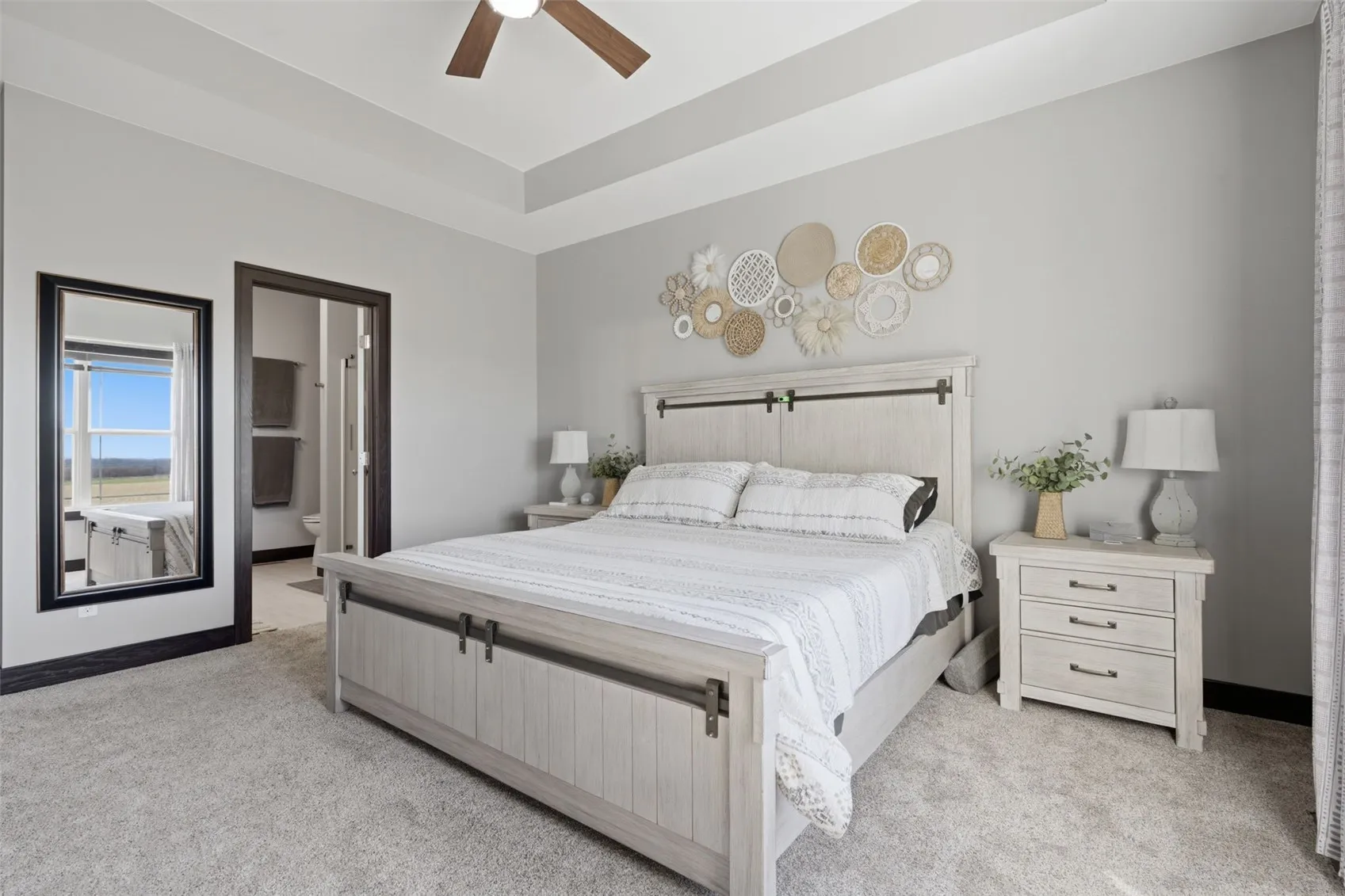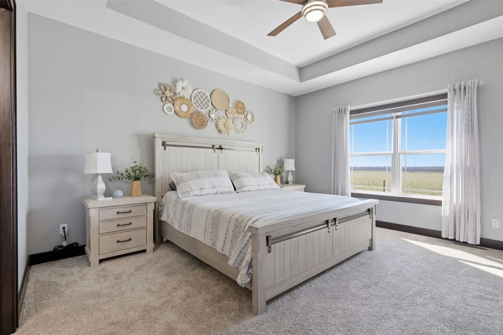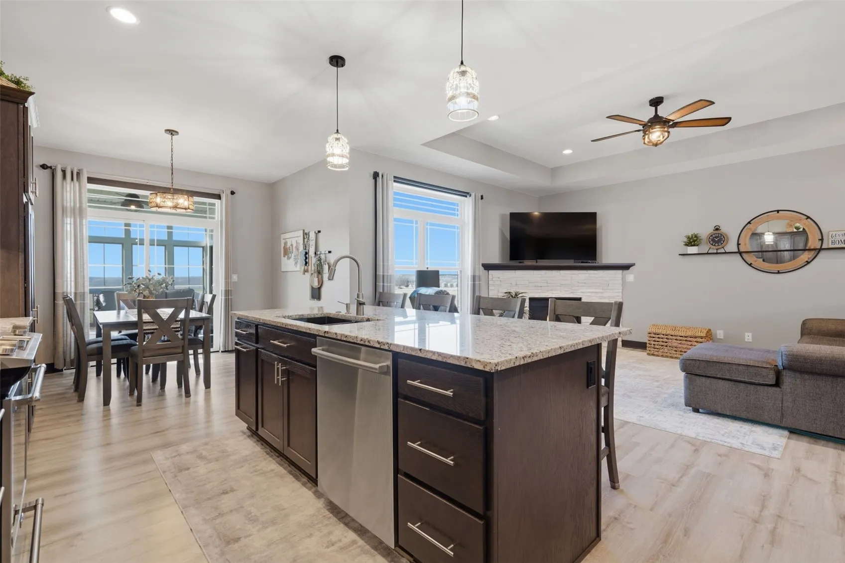 The main level opens with soaring 9-foot ceilings and a living room anchored by a dramatic 10-foot tray ceiling, where natural light pours through large windows and an oversized sliding door. Fresh LVP flooring installed in 2022 flows through the main living area, and updated railings give the space a clean, modern edge. The kitchen is built to impress: an 8-foot island, granite countertops, soft-close cabinetry, double pantry, and stainless appliances combine form and function in equal measure. The custom drop zone off the garage entry keeps everyday life organized the moment you walk in the door, and the laundry room with cabinetry means storage is never an afterthought.
