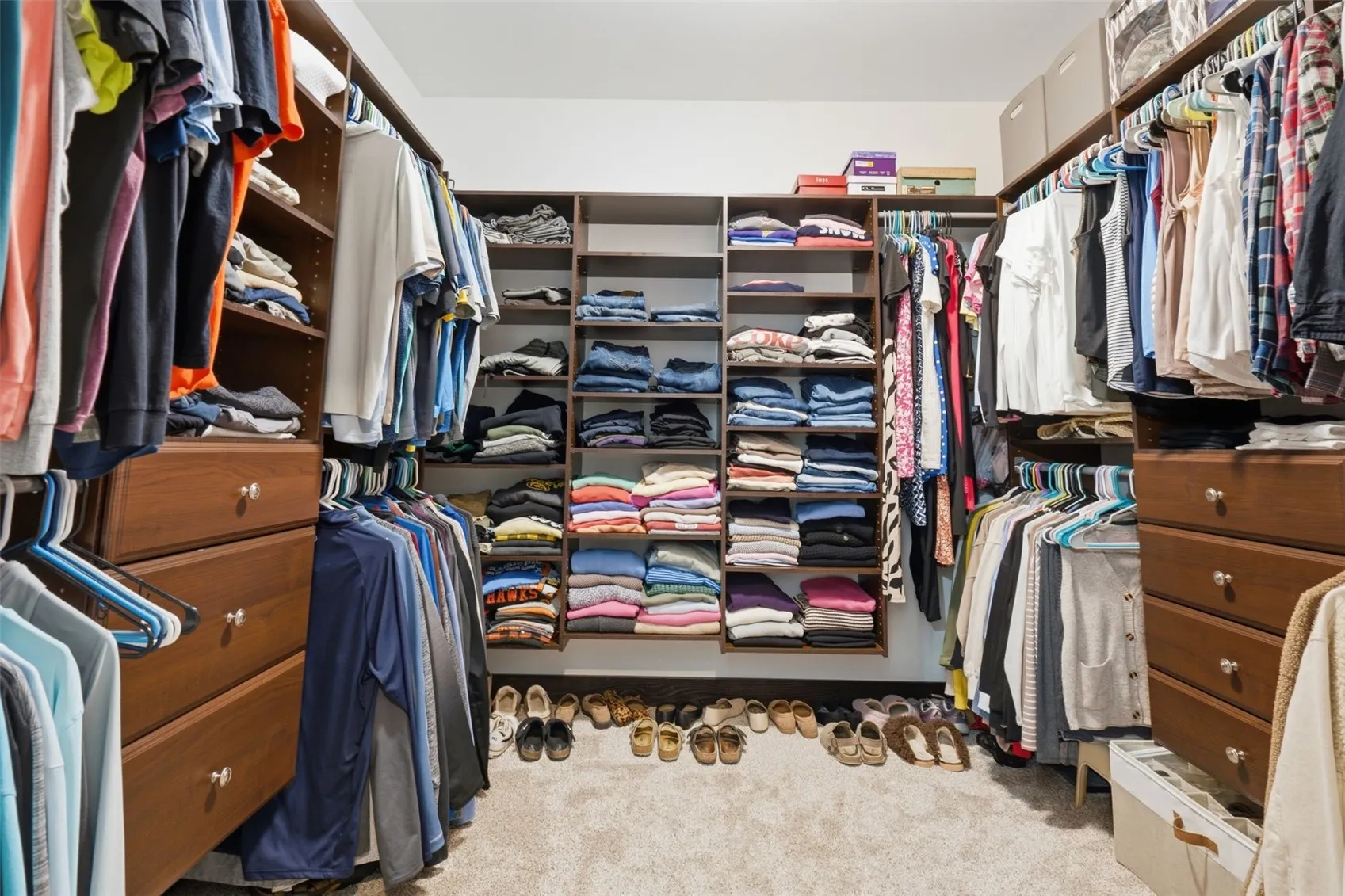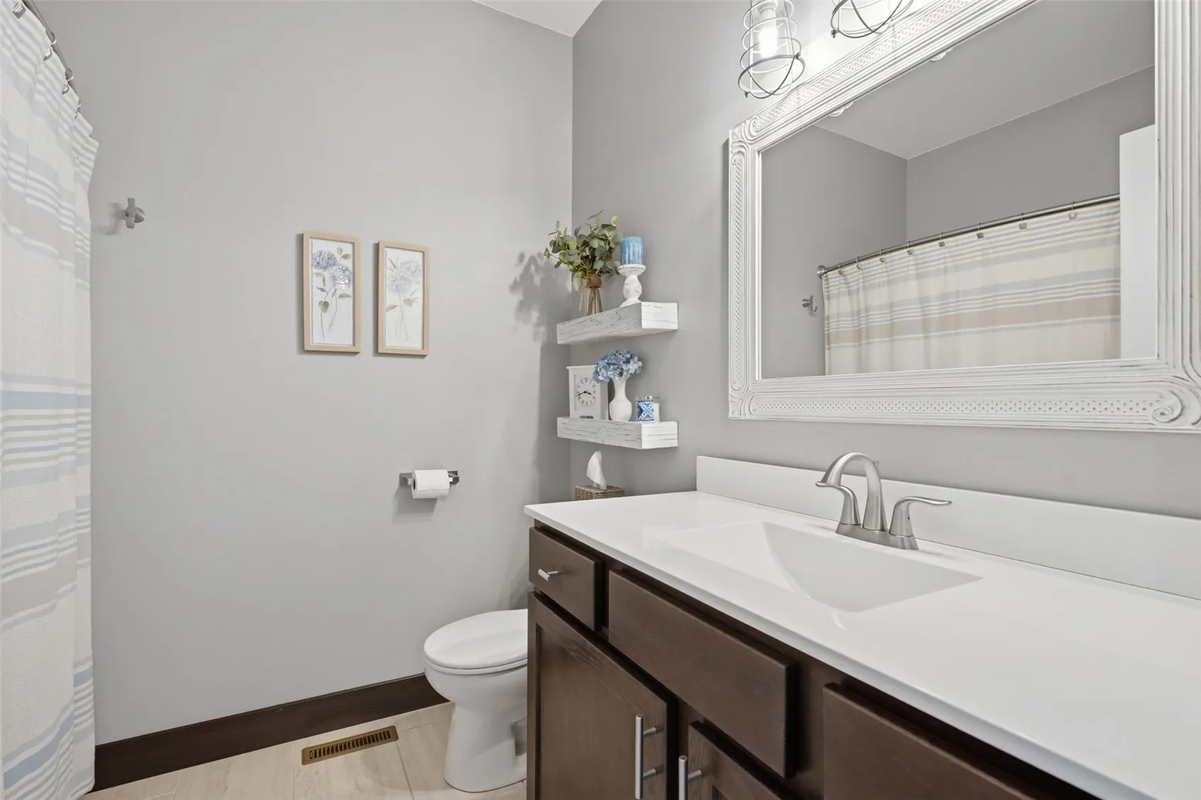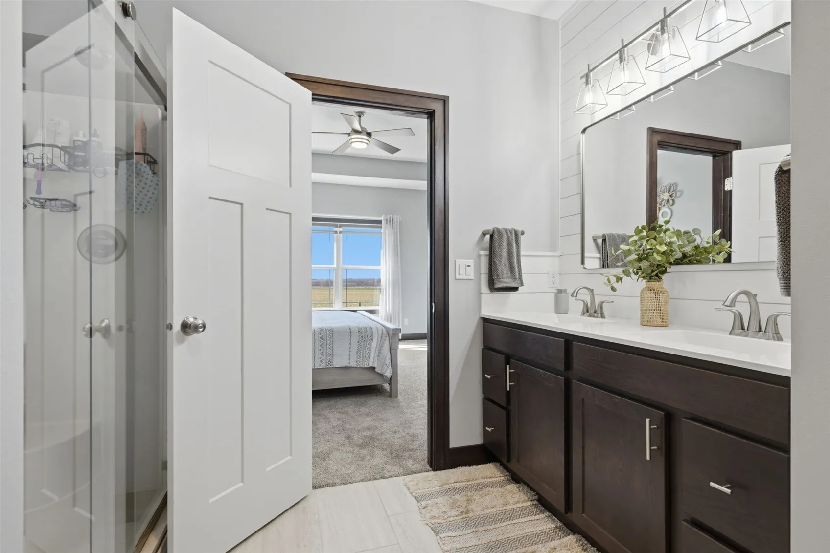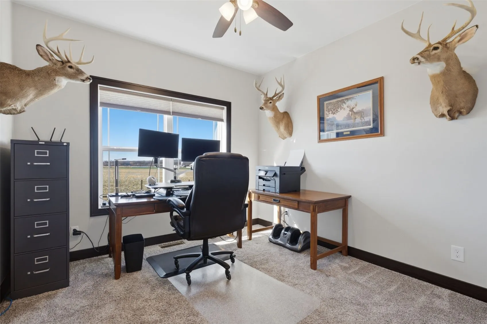 The split-bedroom layout is a genuine differentiator. The private primary suite features a tray ceiling, a double-vanity en suite bath with tile, and a large walk-in closet with custom built-in organizers, all dressed in brand-new carpet installed in January 2025. Two additional bedrooms are tucked to the opposite side of the home, making the layout ideal for families, guests, or anyone who values privacy. Central vac with toe-kicks, a whole-house humidifier, water softener, and included window treatments round out a main level that is genuinely move-in ready.