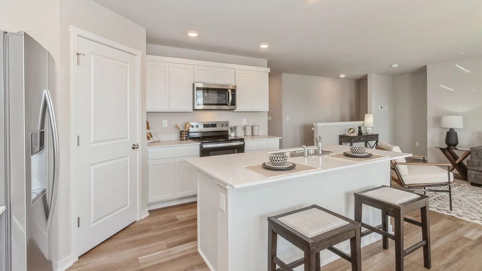 Welcome to the Hamilton in Sycamore Heights – a spacious ranch-style home offering 2,462 sq. ft. of finished living space with 5 bedrooms and 3 bathrooms, including a beautifully finished basement. The open foyer leads past two secondary bedrooms and a full bath—perfect for guests or an office. The kitchen shines with white cabinetry, stainless steel appliances, a large island, and flows seamlessly into the light-filled great room featuring large windows and a cozy electric fireplace. Tucked at the back, the private primary suite includes a walk-in closet, dual-sink vanity, and walk-in shower. Downstairs, enjoy a generous family room, two additional bedrooms, and a third full bath—ideal for guests or multigenerational living. This home offers a walkout basement for added light and easy outdoor access. Call us for a personal tour! Ask about builder incentives with preferred lender. Photos similar to.