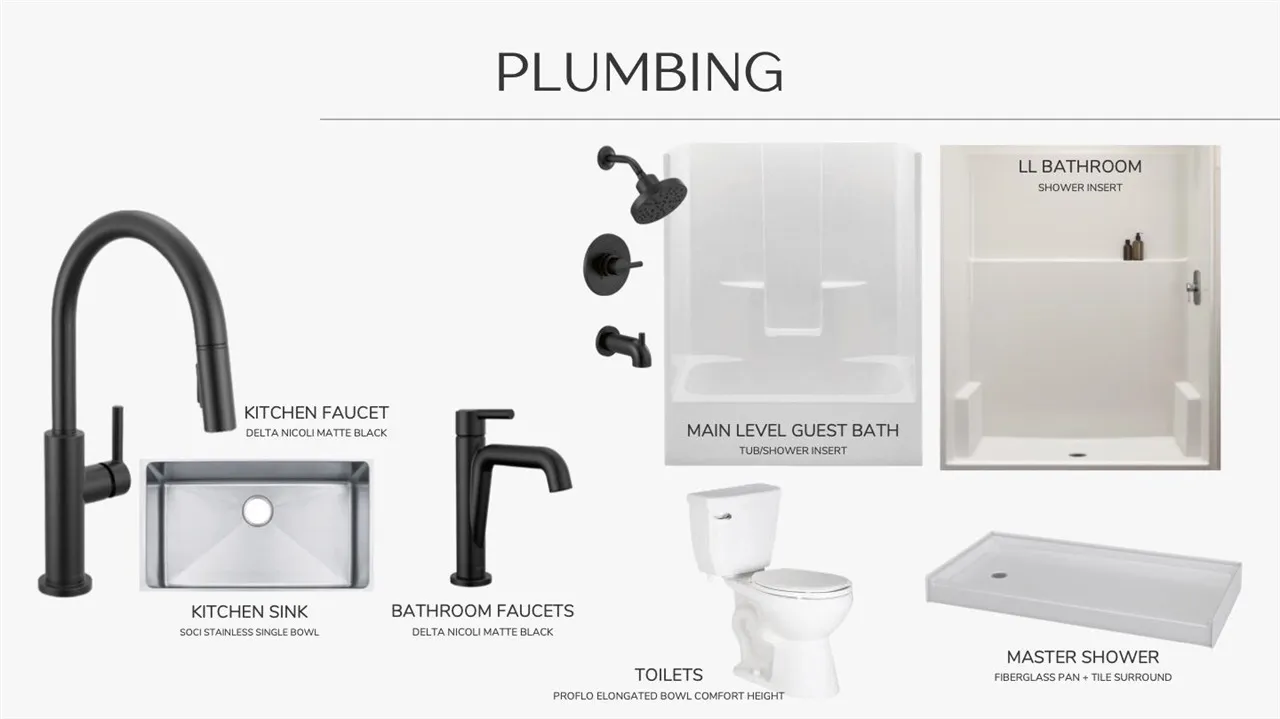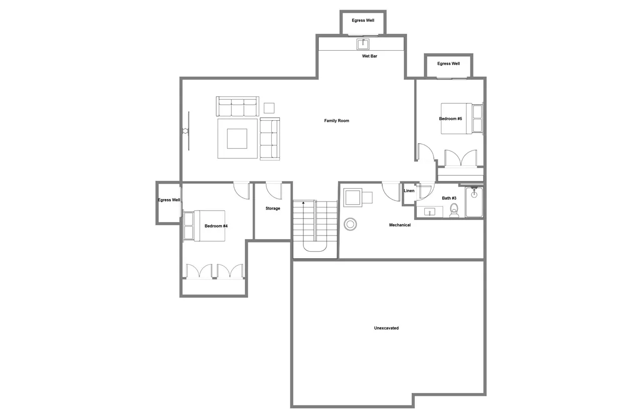 Beautiful new construction ranch in Seven Oaks with over 3,200 finished sq ft, 5 bedrooms, 3 bathrooms, and a 3-car garage. This home offers an open main level with a stunning kitchen featuring stained cabinetry, quartz countertops and backsplash, large island, Frigidaire appliances, gas range, vent hood, and walk-in pantry. The living room showcases ceiling beams, stone fireplace, built-ins, and custom arched details for added warmth and style. The main floor includes a spacious primary suite with walk-in closet and tiled shower, plus two additional bedrooms, full bath, and convenient mudroom/laundry. The finished lower level provides even more living space with a large family room, wet bar, two additional bedrooms, full bath, and storage. Outside, enjoy James Hardie siding, stone accents, wood-tone garage doors, and a concrete patio. Sharp design, functional layout, and quality finishes make this one stand out. Completion expected Fall 2026. **Finishes and layout depicted are subject to change, concept only.**