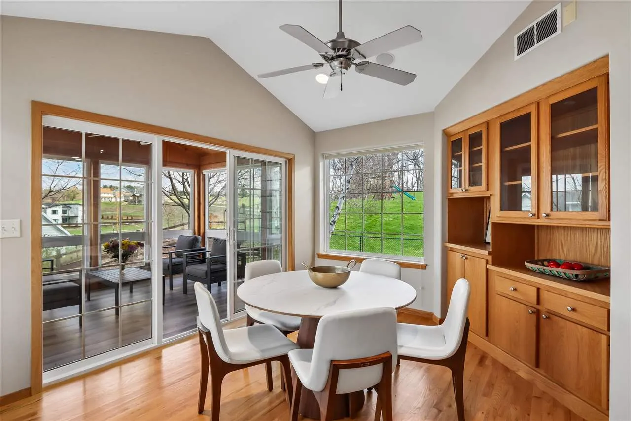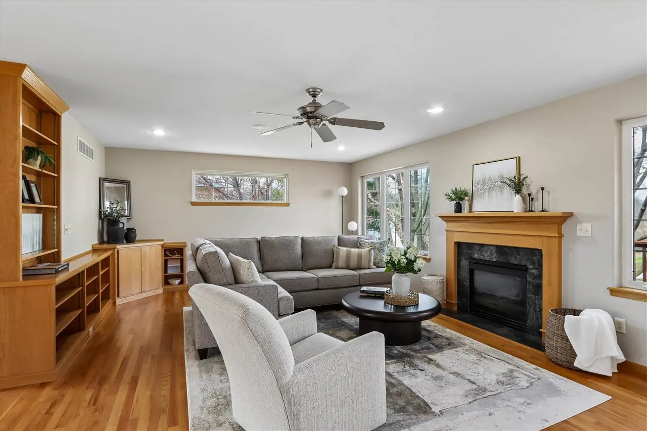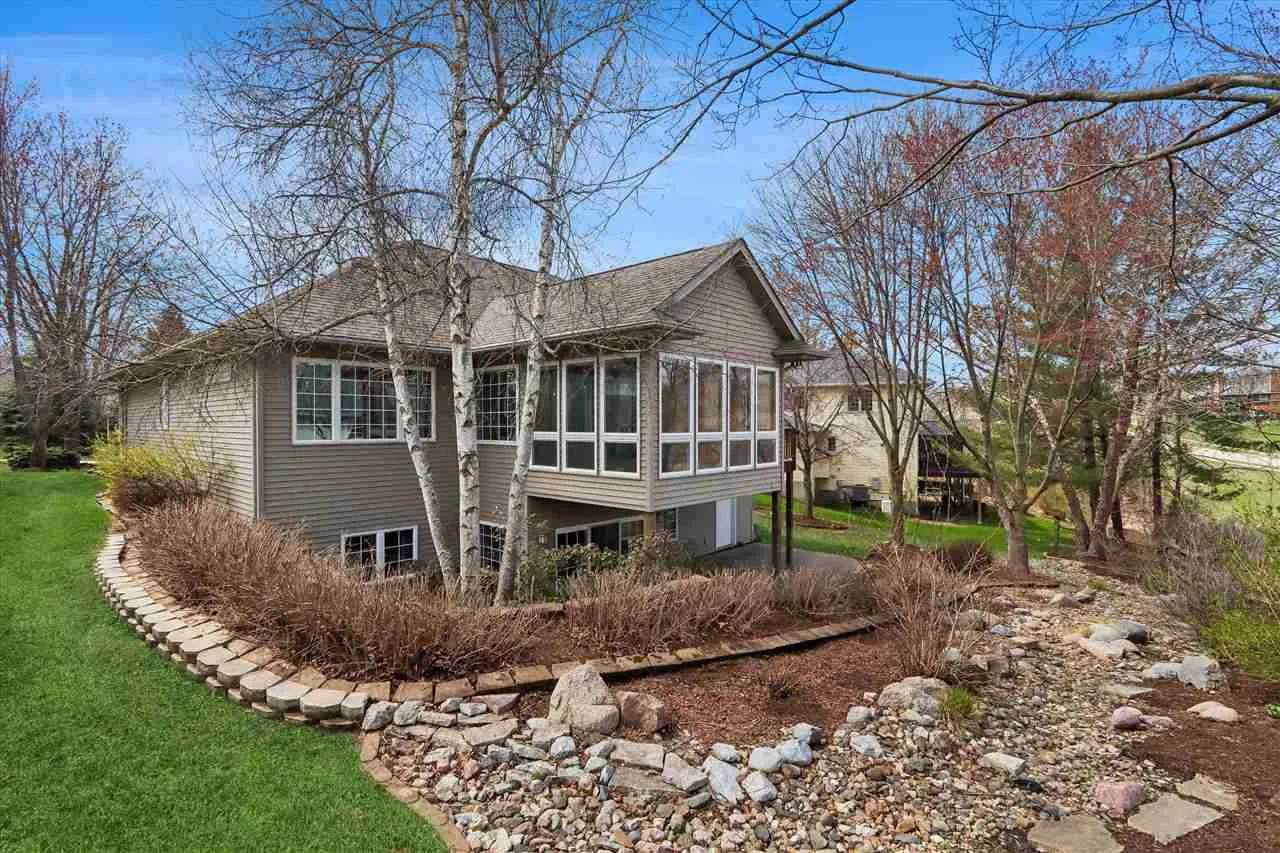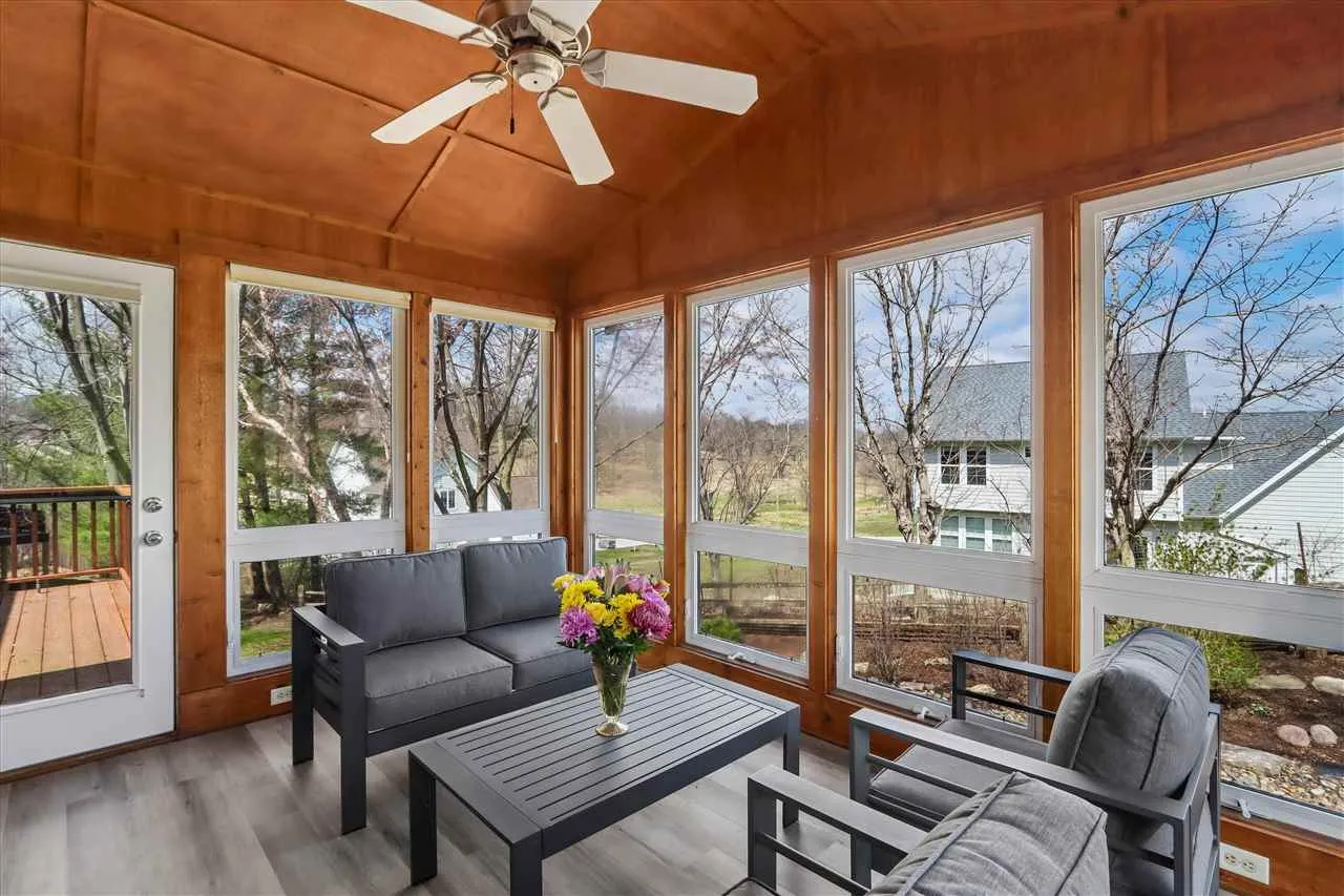 Welcome to this well-maintained home tucked on a quiet cul-de-sac amid mature trees and beautifully established landscaping. It offers a wonderful sense of privacy while remaining close to the conveniences of Coralville, North Liberty, and Iowa City. The main level features a gracious living room with hardwood floors, built-ins, and a gas fireplace, with an open connection to the foyer and dining area. The kitchen is positioned with large passthroughs to the living room, creating both connection and definition between spaces. The dining area opens to a 3-season cedar porch with an included heating unit and abundant windows, while a nicely sized deck just beyond overlooks the lush backyard. The main level also includes a spacious primary suite with an updated bath, a second bedroom currently presenting as a home office with a built-in desk and bookshelves, and a convenient half bath. The finished lower level includes a family room with walkout access to the patio, two bedrooms, one with an ensuite bath and the other across the hall from a third full bath. A garden/workshop room with a utility sink and exterior door adds flexibility. The roof was new in March 2023, and the home enjoys the peace of mind of a whole-home Generac generator. Outside, a dry creek and flagstone path complete the park-like setting.