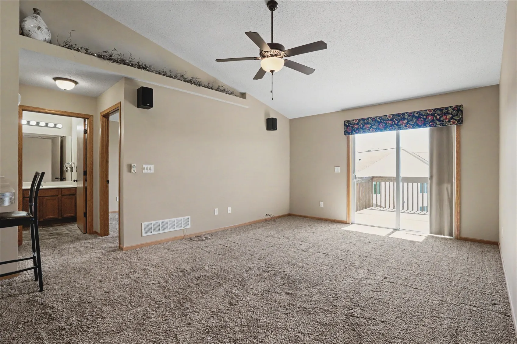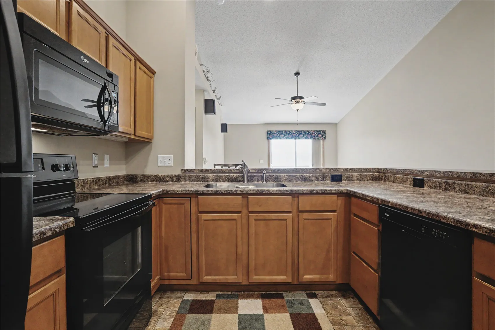 kitchen space with plenty of storage, and into your living room. Views outside your sliding screen door to your deck