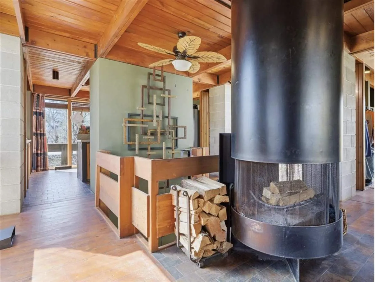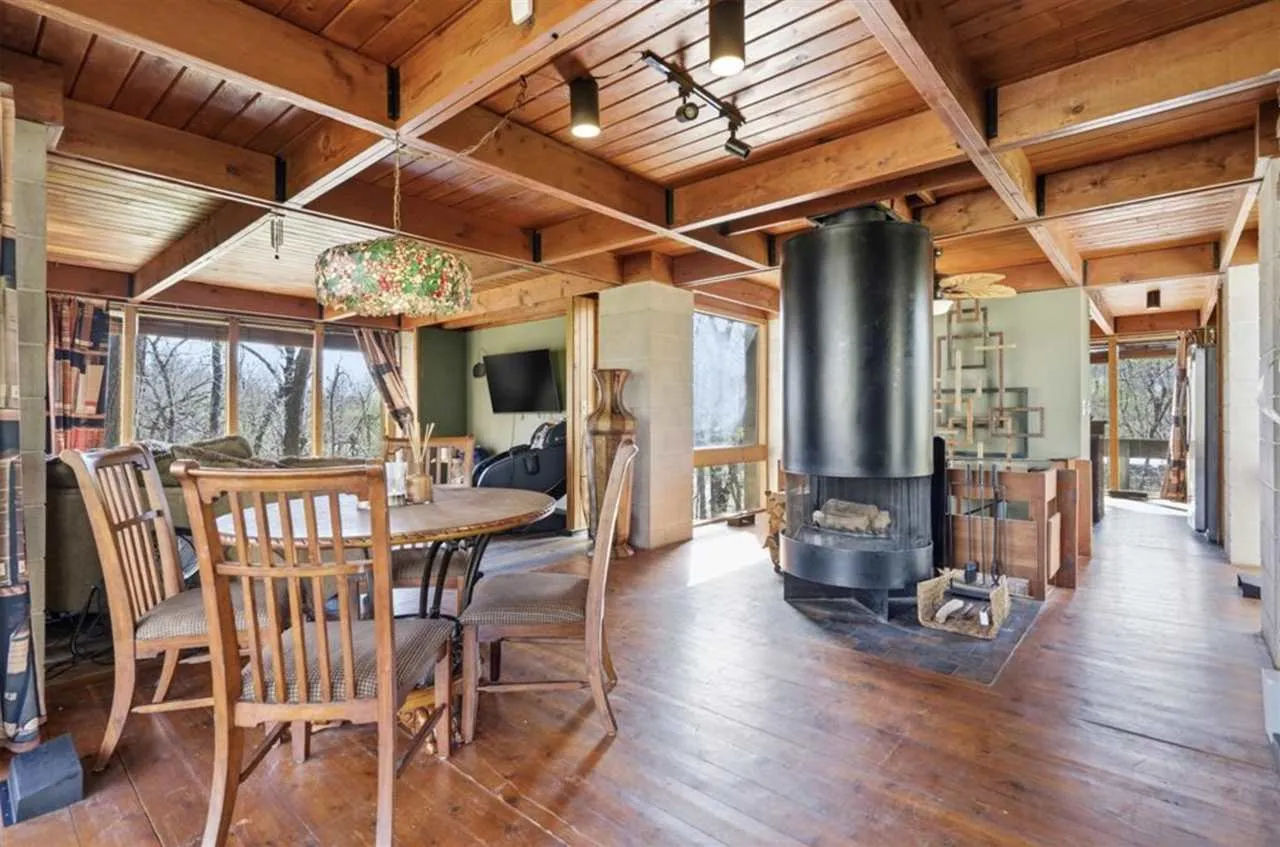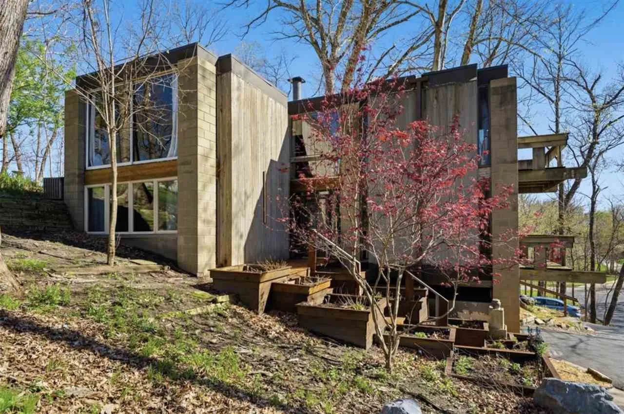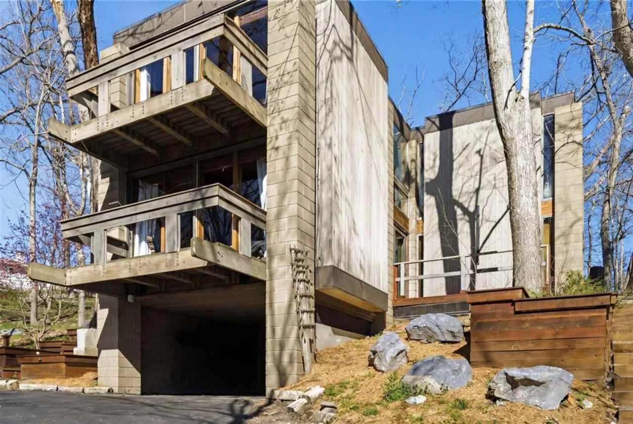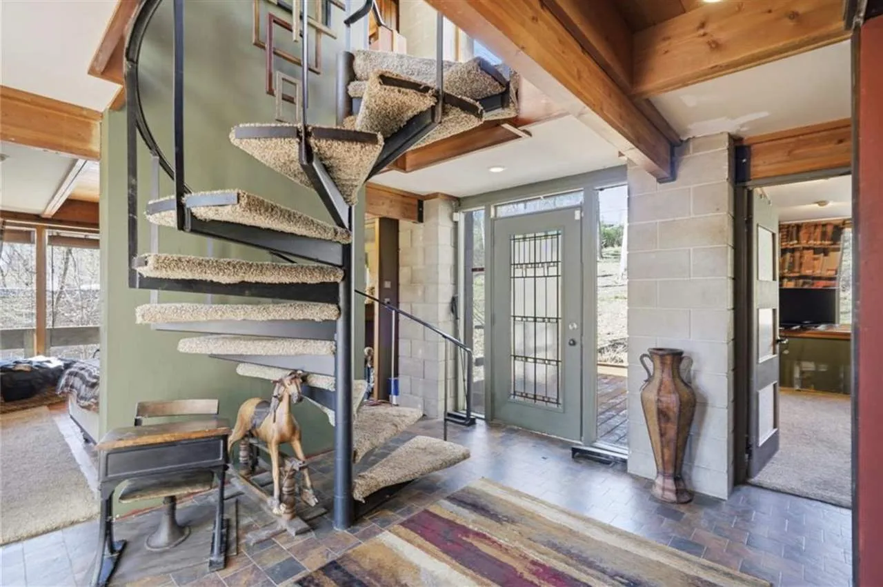 Acreage & architecturally distinctive contemporary home nestled among mature trees, featuring bold geometric lines, concrete block construction, and expansive windows framing wooded views. Designed and built by noted designer Thomas Reilly—who personally resided in the home—this property reflects exceptional craftsmanship and recognized architectural significance. Multi-level decks, soaring ceilings, and a striking spiral staircase create visual interest, while warm wood accents balance the modern design. Walls of glass connect indoor and outdoor living, filling the home with natural light and offering peaceful treetop views from nearly every room. The unique layout provides inviting gathering spaces alongside a dedicated piano room for creativity or quiet retreat. Custom built-ins enhance both function and design continuity. Outside, expansive decks and terraces offer ideal spaces for relaxing and entertaining. A reclaimed wood accent wall—reportedly sourced from a historic pirate ship—adds character and conversation. Add’l storage beneath the carport/drive adds practical value. The hillside setting provides privacy while remaining conveniently located. A truly one-of-a-kind property blending design, comfort, and nature with multiple gathering spaces that feel both open and inviting, the home celebrates its natural surroundings
