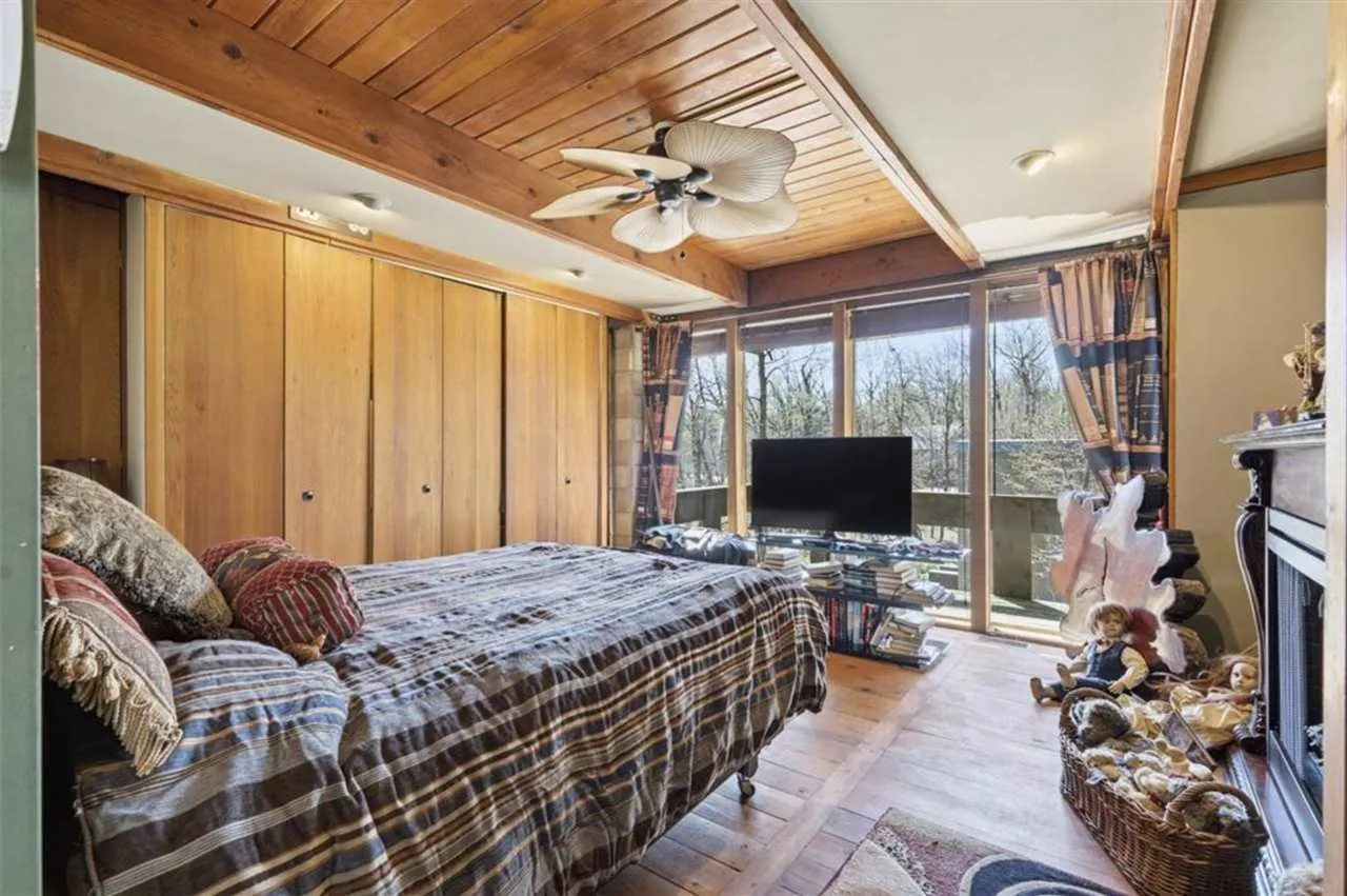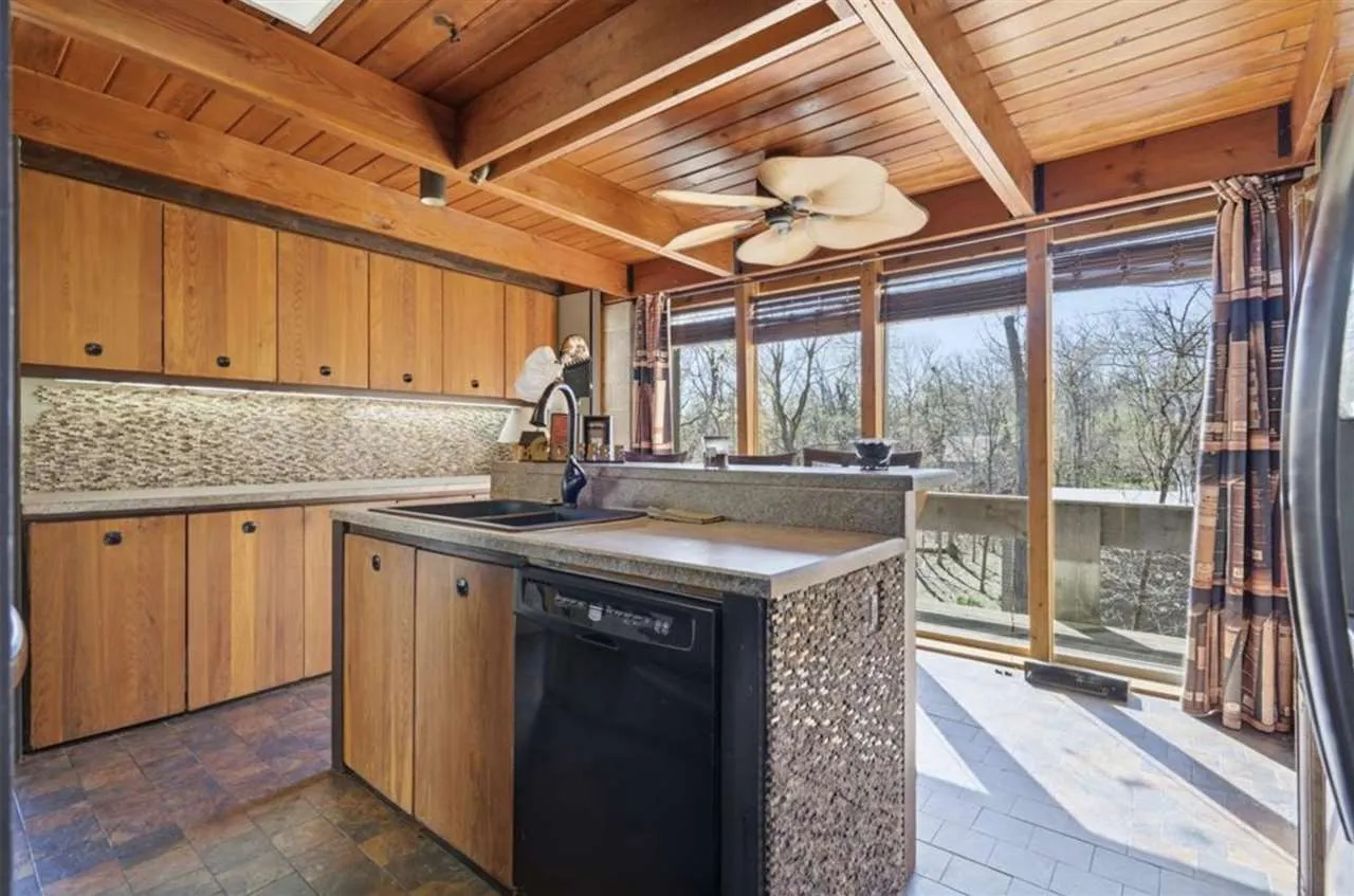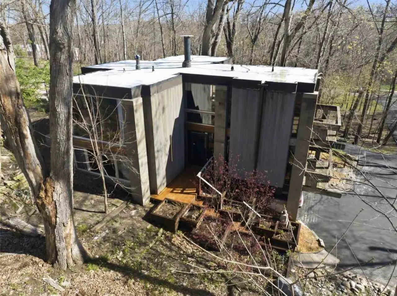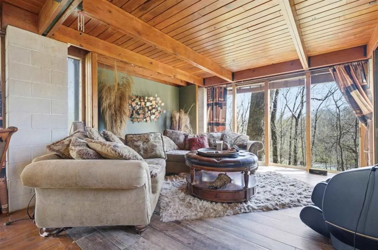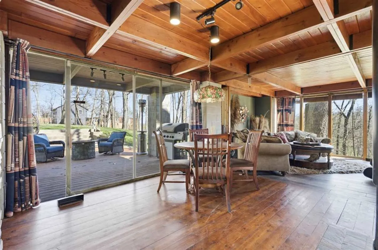 Acreage & architecturally distinctive contemporary home nestled among mature trees, featuring bold geometric lines, concrete block construction, and expansive windows framing wooded views. Designed and built by noted designer Thomas Reilly—who personally resided in the home—this property reflects exceptional craftsmanship and recognized architectural significance. Multi-level decks, soaring ceilings, and a striking spiral staircase create visual interest, while warm wood accents balance the modern design. Walls of glass connect indoor and outdoor living, filling the home with natural light and offering peaceful treetop views from nearly every room. The unique layout provides inviting gathering spaces alongside a dedicated piano room for creativity or quiet retreat. Custom built-ins enhance both function and design continuity. Outside, expansive decks and terraces offer ideal spaces for relaxing and entertaining. A reclaimed wood accent wall—reportedly sourced from a historic pirate ship—adds character and conversation. Add’l storage beneath the carport/drive adds practical value. The hillside setting provides privacy while remaining conveniently located. A truly one-of-a-kind property blending design, comfort, and nature with multiple gathering spaces that feel both open and inviting, the home celebrates its natural surroundings