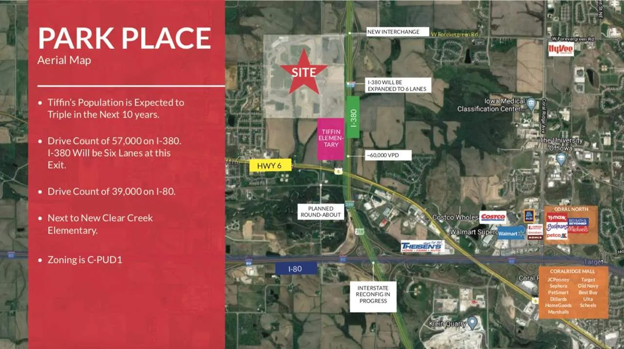 New commercial development off of the I-380/Forevergreen exit ramp. Be visible & accessible to 57,000 cars a day while being surrounded by rooftops. Great proximity to residential. The city of Tiffin is expected to see significant growth in the foreseeable future with nearby major employers Heartland Trucking, Headquarters of Green State Credit Union, Geico, and more. Top Tracer golf range/entertainment venue will be joining the development coming 2022. Site pads to purchase or build-to-suit (leasing opportunities also available).