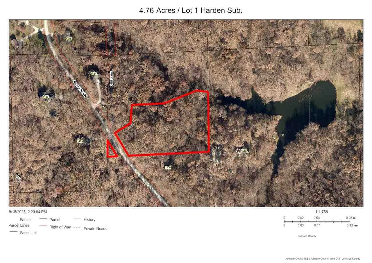 Rare find! This is one of 2 very nice heavily wooded walkout lots nestled into mature native Iowa timber in a secluded area off a dead-end road. The building sites have already been cleared, and a partial trail cut into the timber. Located approximately 14 miles to Cedar Rapids or Coralville, and just minutes to the Coralville Lake & Recreation areas. Electric & South Slope Telephone & Internet lines will be ran to each lot’s property line, and the future private well & septic to be installed by Buyer. There will be minimal covenants. Lot 1 is 4.76 Acres and Lot 2 is 4.91 Acres